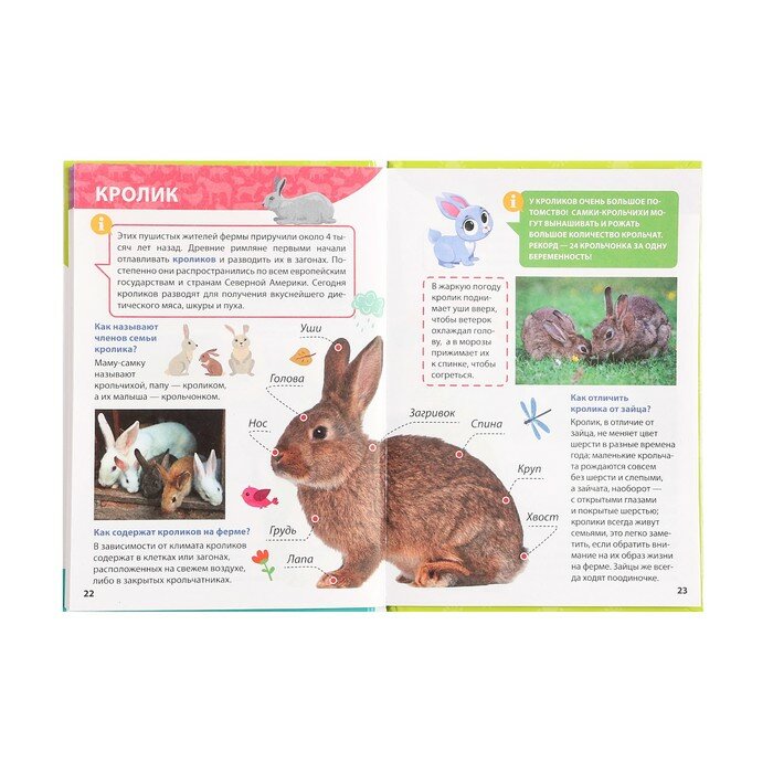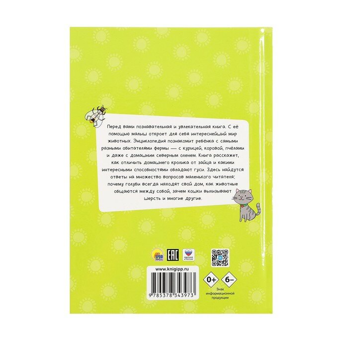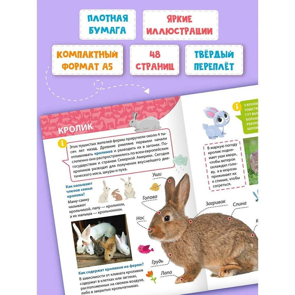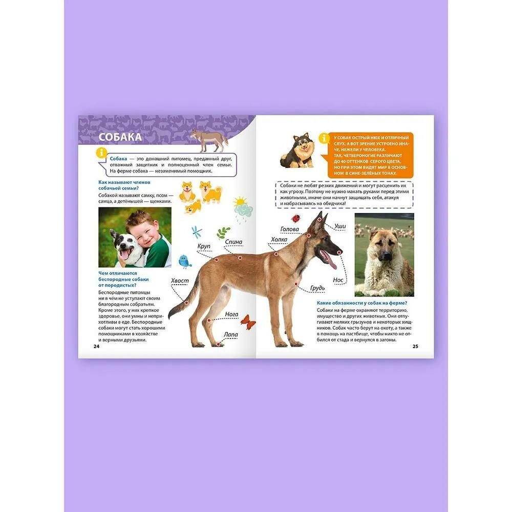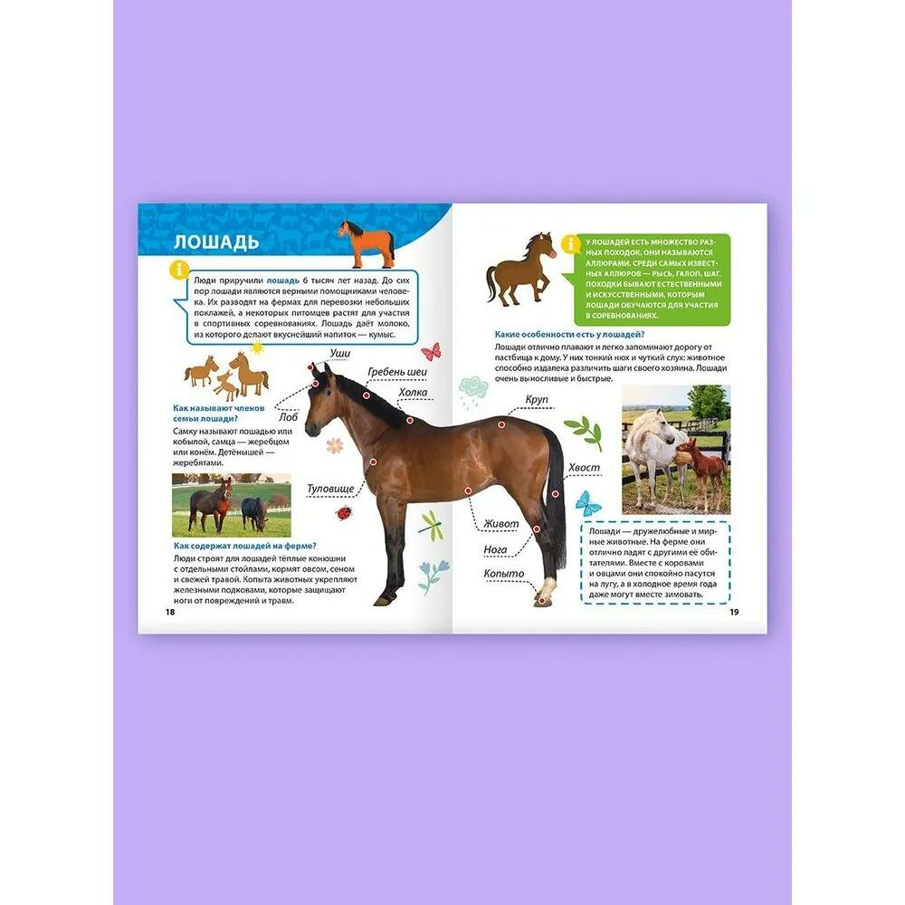 Перед вами познавательная а увлекательная книга. С её помощью малыш откроет для себя интереснейший мир животных. Энциклопедия познакомит ребёнка с самыми разными обитателями фермы — с курицей, коровой, пчёлами и даже с домашним северным оленем. Книга расскажет, как отличить домашнего кролика от зайца и какими интересными способностями обладают гуси. Здесь найдутся ответы на множество вопросов маленького читателя; почему голуби всегда находят свой дом, как животные общаются между собой, зачем кошки вылизывают шерсть и многие другие.