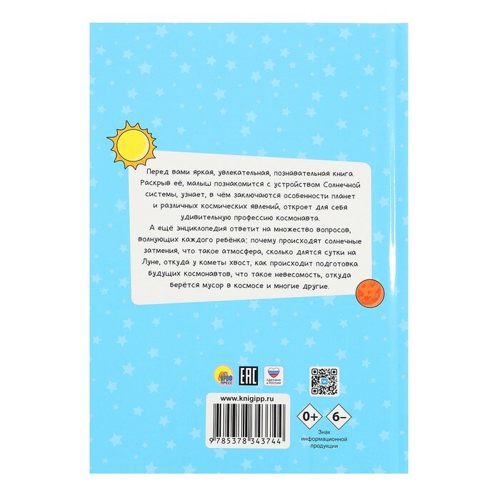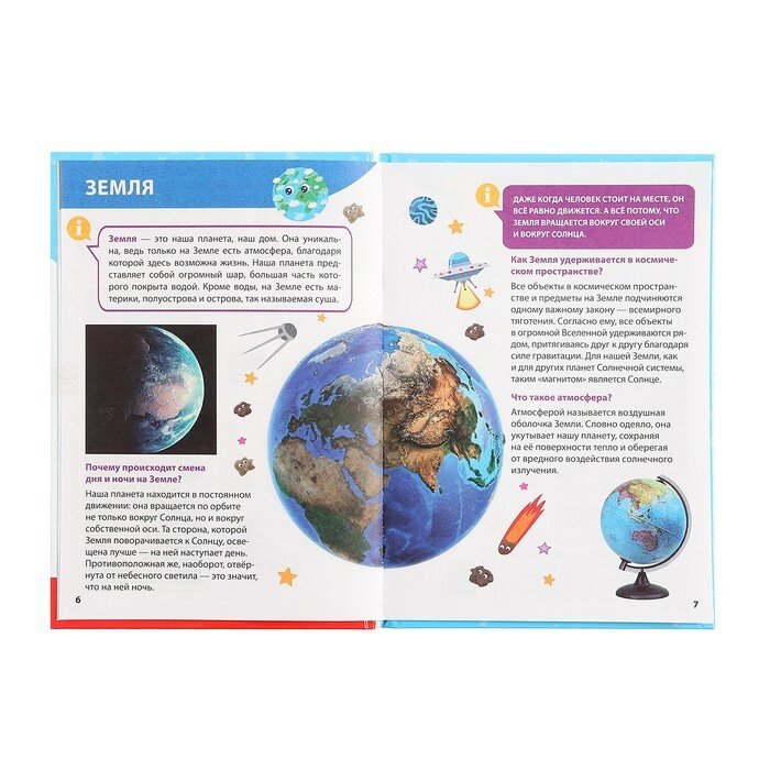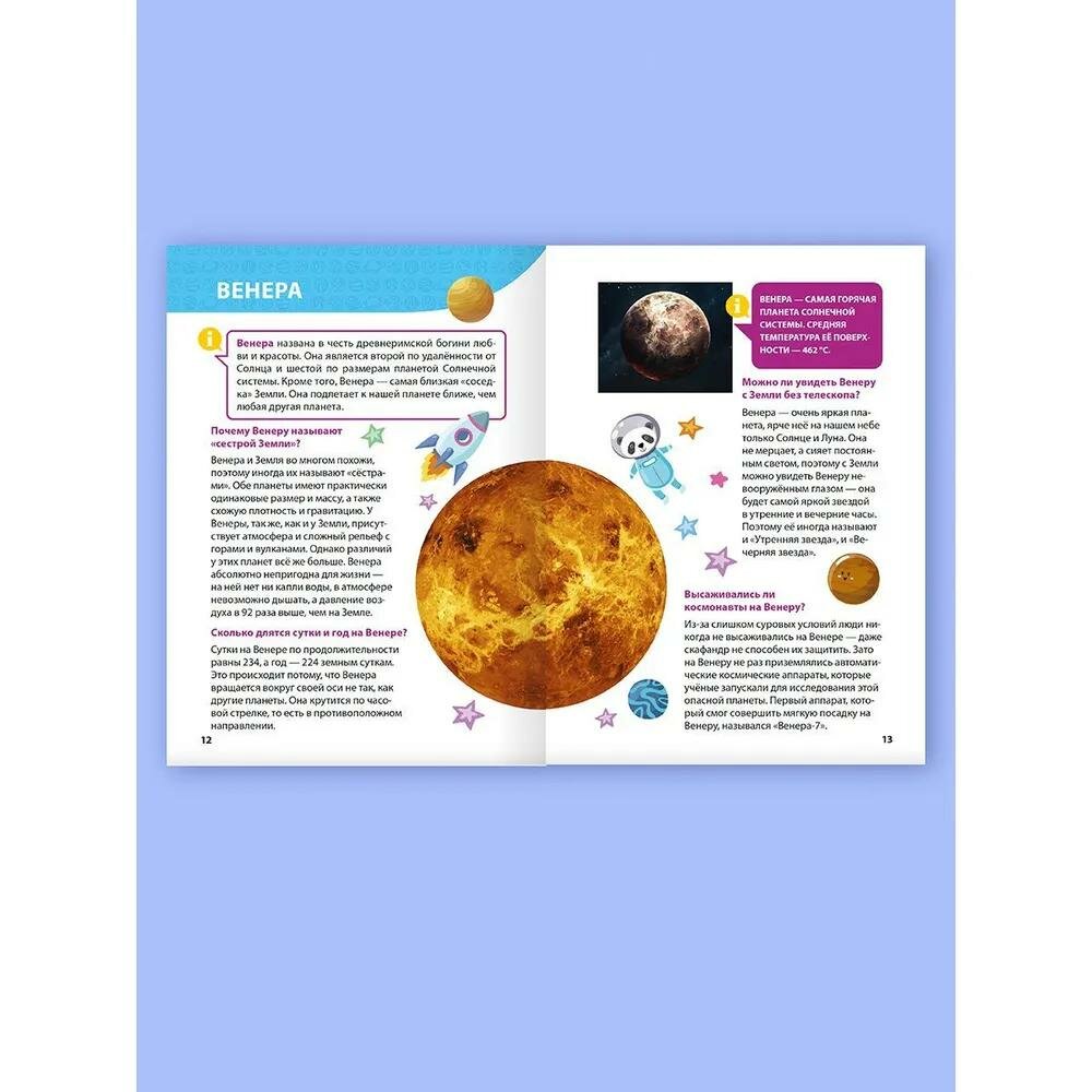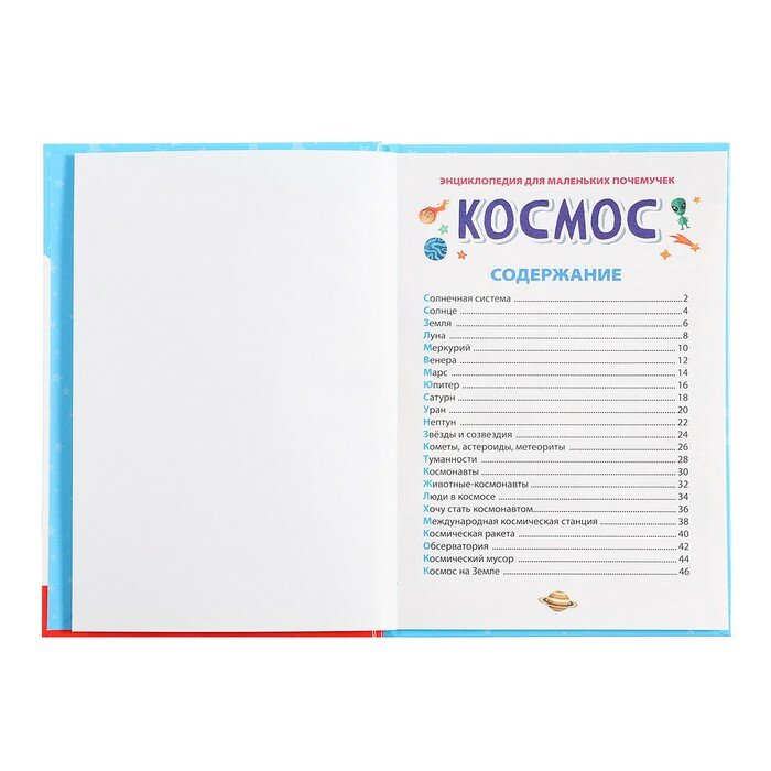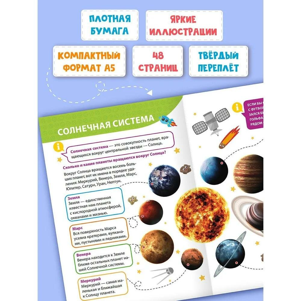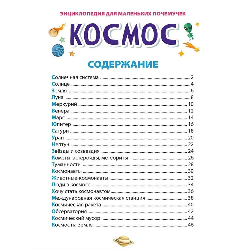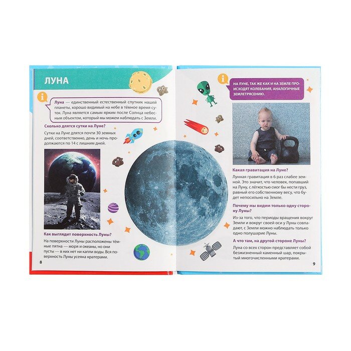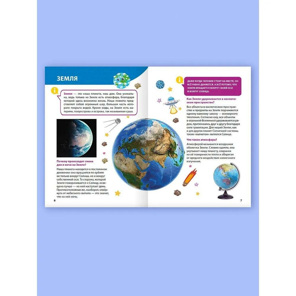 А ещё энциклопедия ответит на множество вопросов, волнующих каждого ребёнка; почему происходят солнечные затмения, что такое атмосфера, сколько длятся сутки на Луне, откуда у кометы хвост, как происходит подготовка будущих космонавтов, что такое невесомость, откуда берётся мусор в космосе и многие другие.