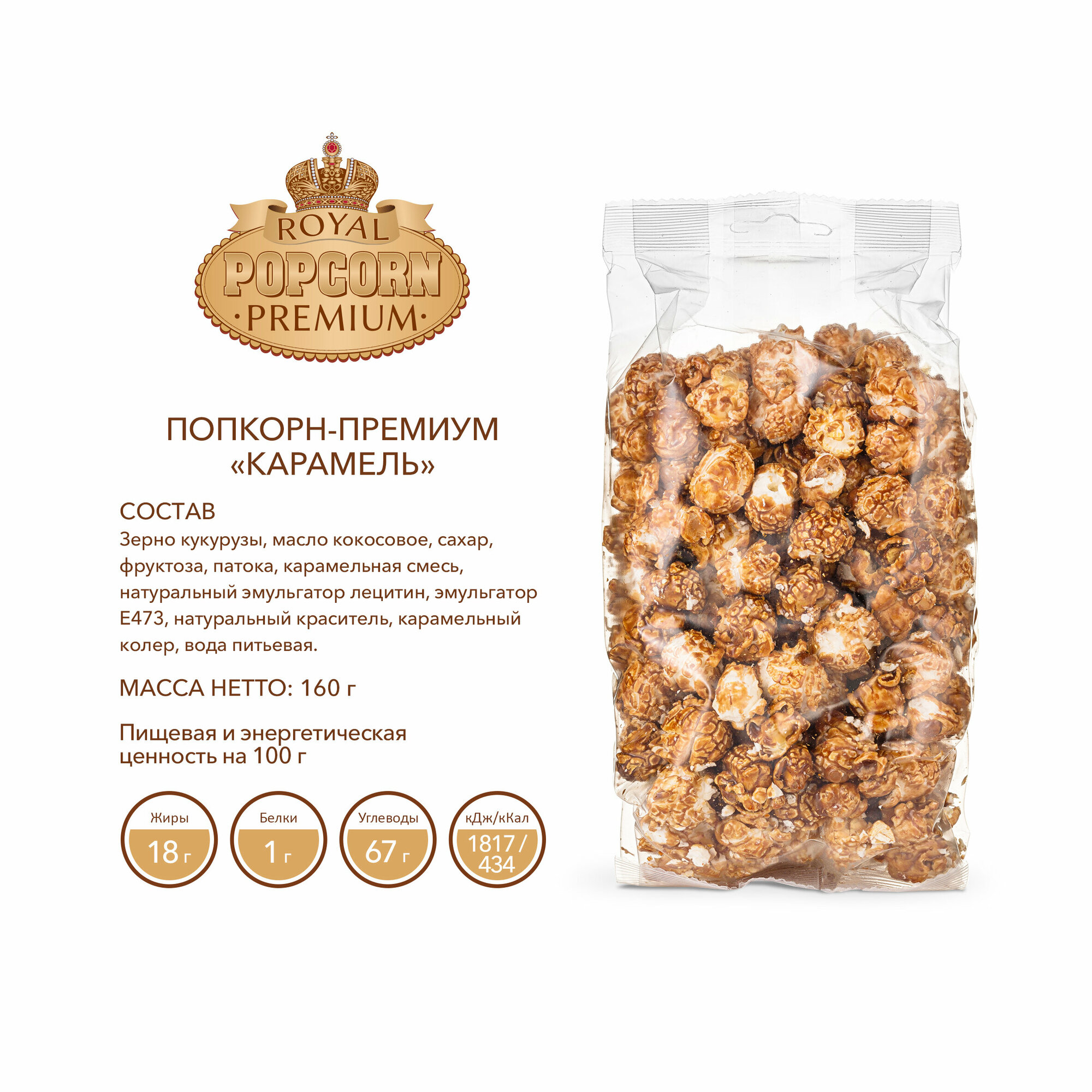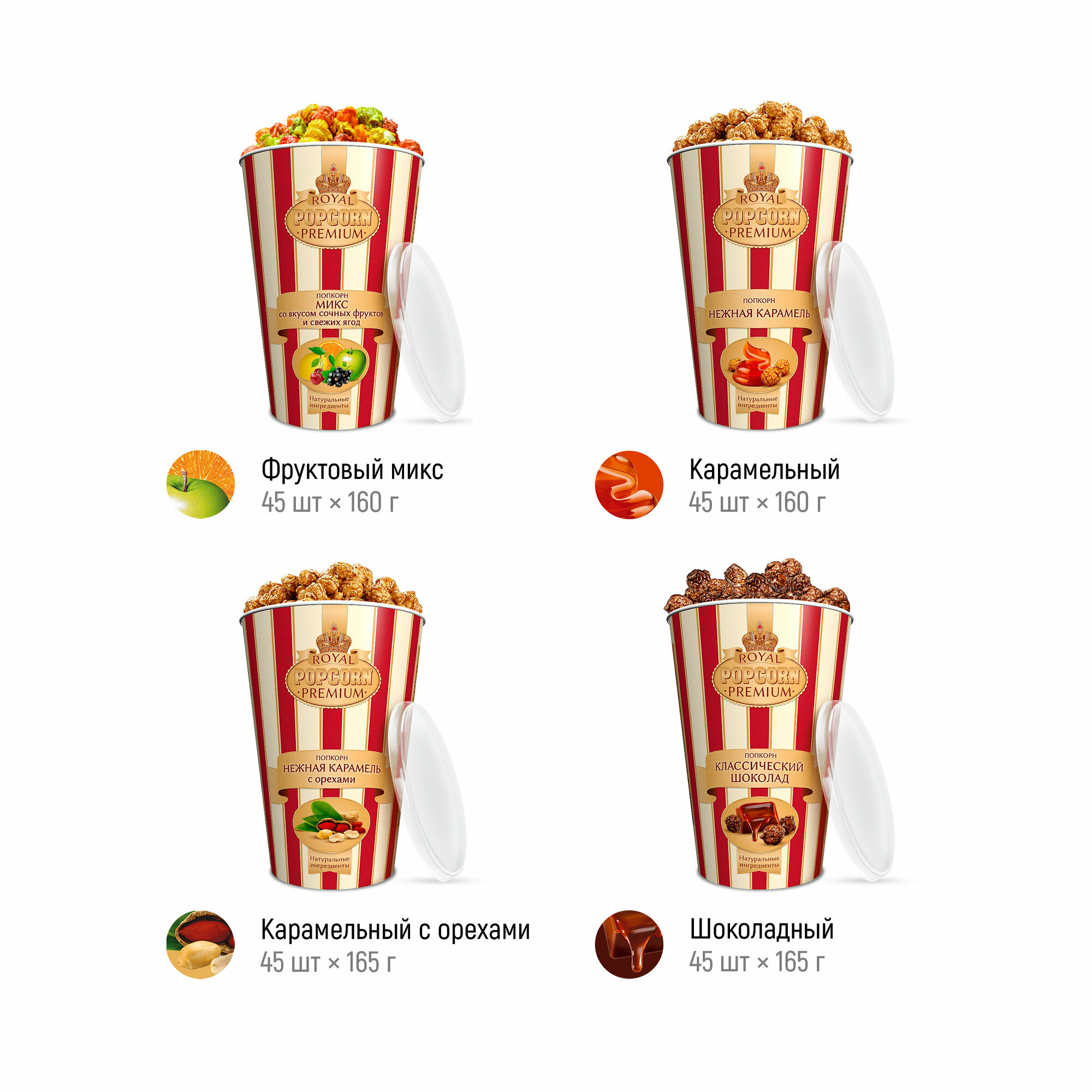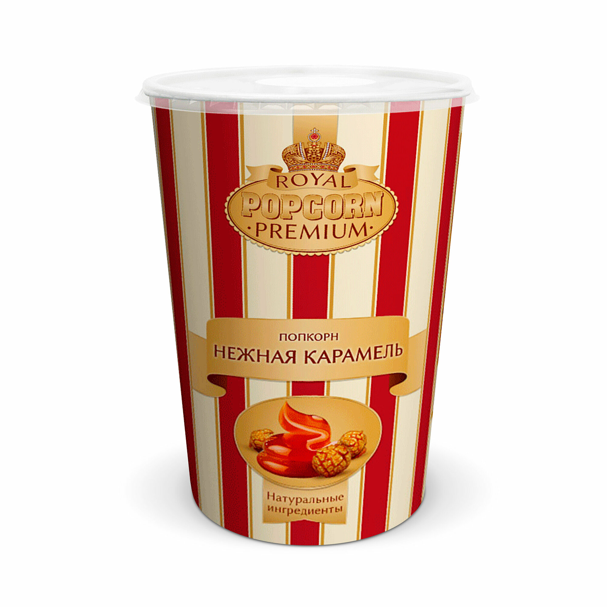Готовый попкорн вRoyal Popcorn Premium со вкусом карамели в брендированном стакане выполненом из плотного картона. Для сохранения продукта стакан закрывается плотной пластиковой крышкой.