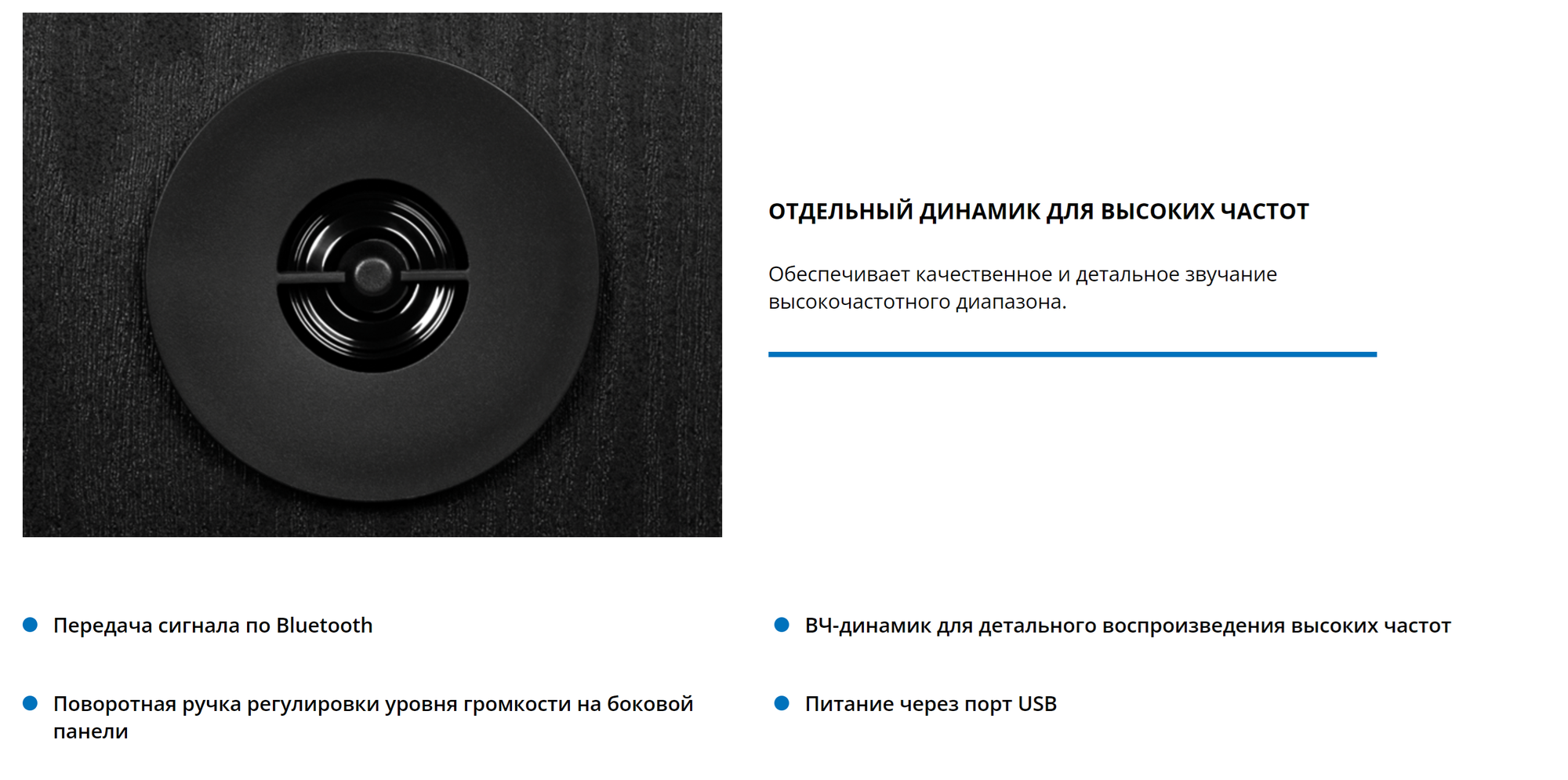| Прочие особенности и свойства | Передача сигнала по Bluetooth, Поворотная ручка регулировки уровня громкости на боковой панели, ВЧ-динамик для детального воспроизведения высоких частот, Питание через порт USB |