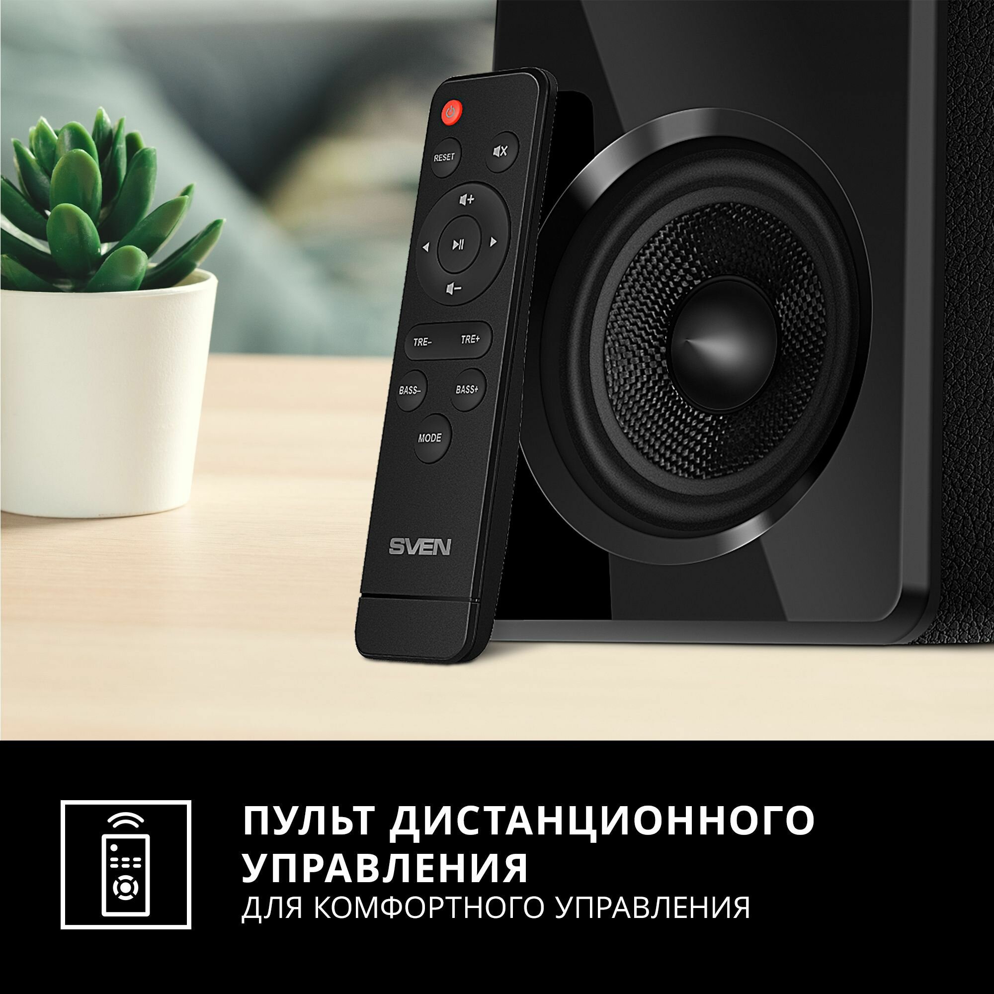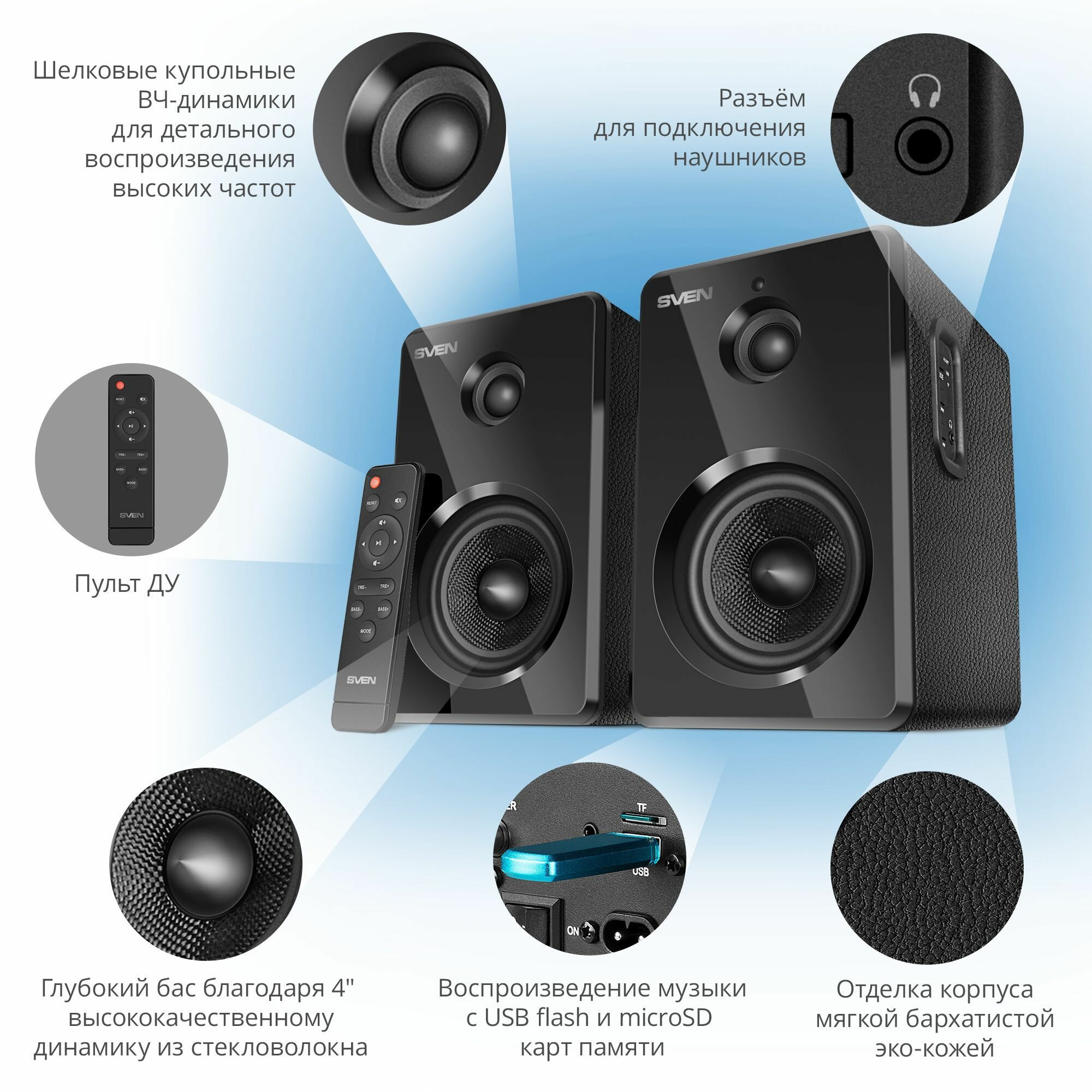 Управление комплектом может осуществляться дистанционно с помощью удобного пульта, предусмотрен разъем для наушников — для их подключения не придется тянуться к источнику, что особенно важно при использовании акустики совместно с ПК. Каждая деталь — от внешнего вида до особенностей конструкции продумана и проработана, чтобы доставить максимум радости владельцу.