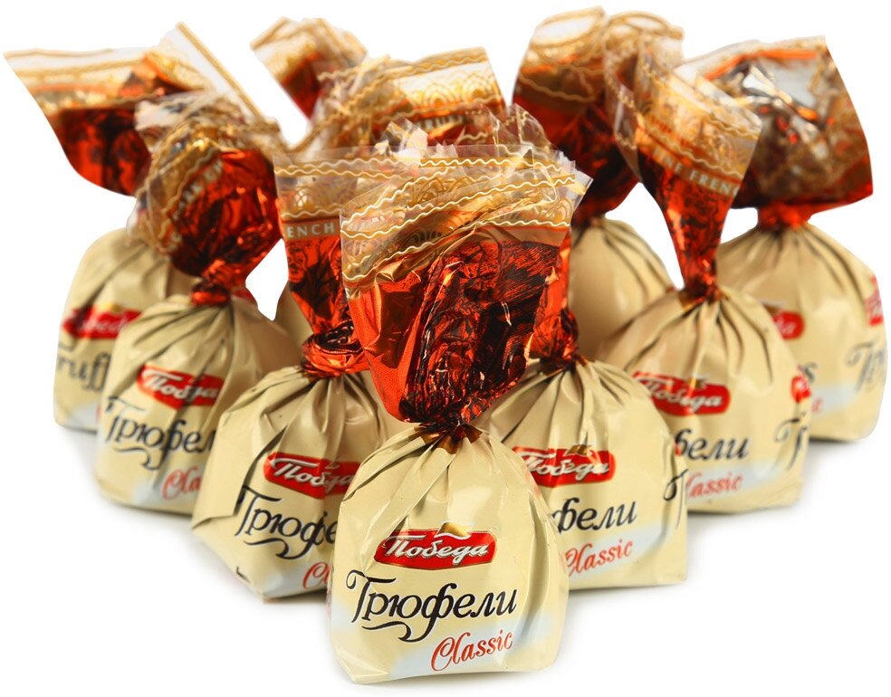 В ассортименте серии трюфелей с марципаном Победа есть композиции с посыпкой из темного какао или тертого итальянского сыра маскарпоне традиционной основы изысканного десерта тирамису. Сама же трюфельная основа смешивается с кофе Мокка или протертым грецким орехом.