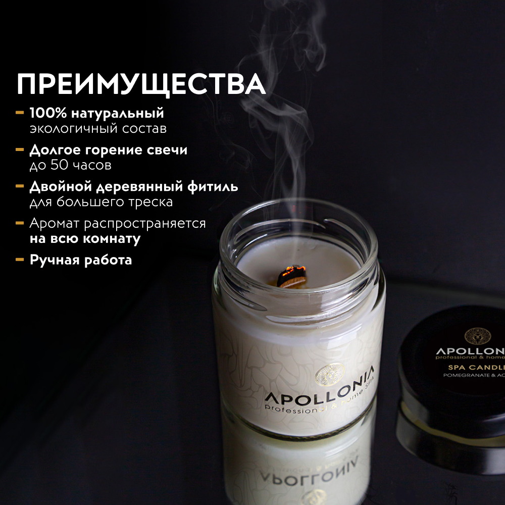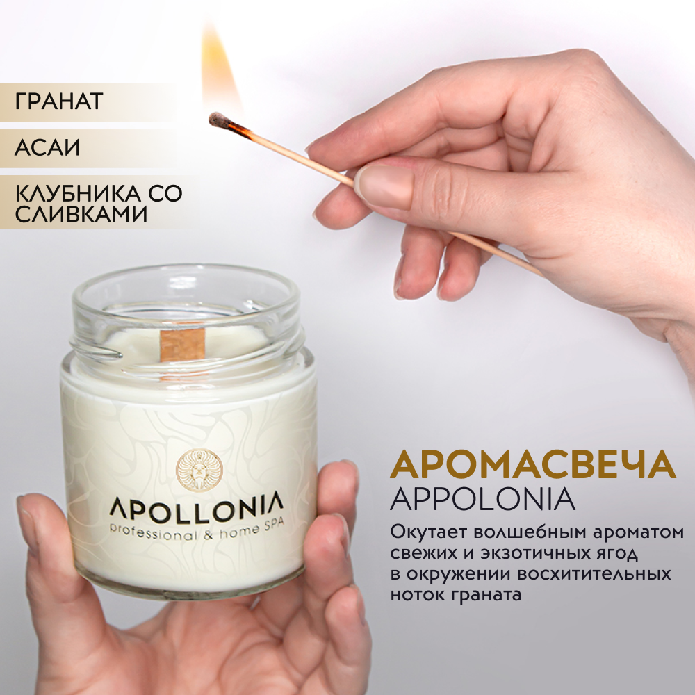 Аромасвеча APOLLONIA SPA CANDLE POMEGRANATE & ACAI окутает волшебным ароматом свежих и экзотичных ягод асаи в окружении восхитительных ноток граната, прекрасно впишется в интерьер, станет не только атрибутом вашего домашнего SPA, но и отличным подарком на любые праздники. Деревянный фитиль напомнит потрескивание дров в камине и подарит приятные ощущения уюта и гармонии.