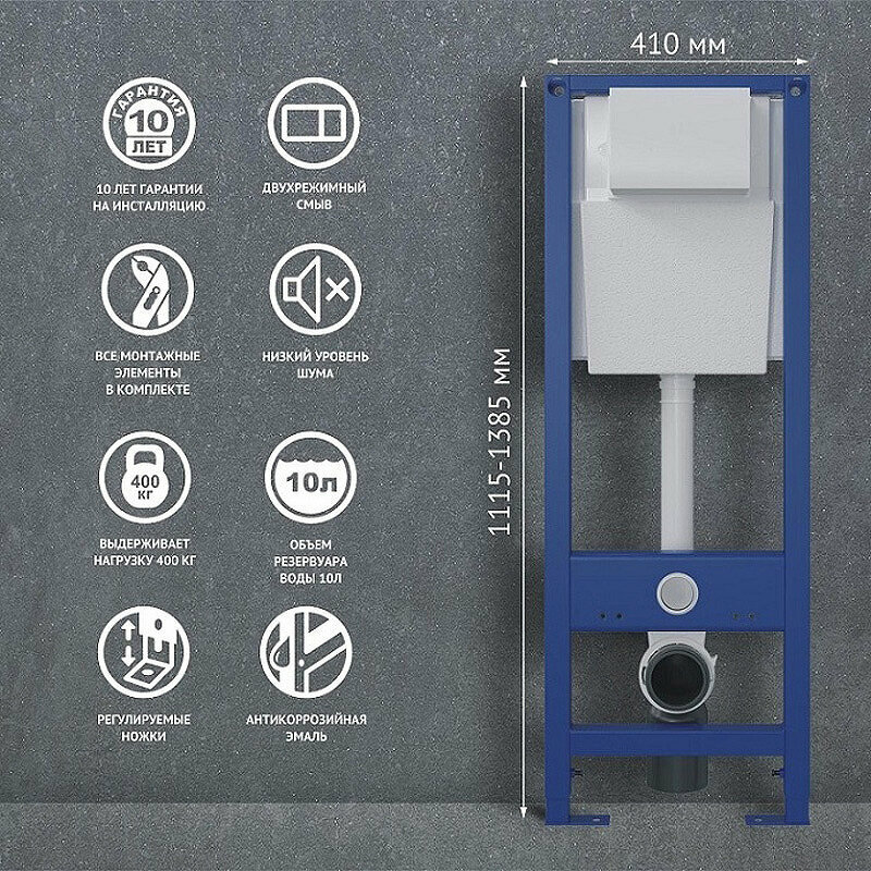 В состав комплекта входит: инсталляция, унитаз и крепежные элементы, шумоизоляция и клавиша смыва.