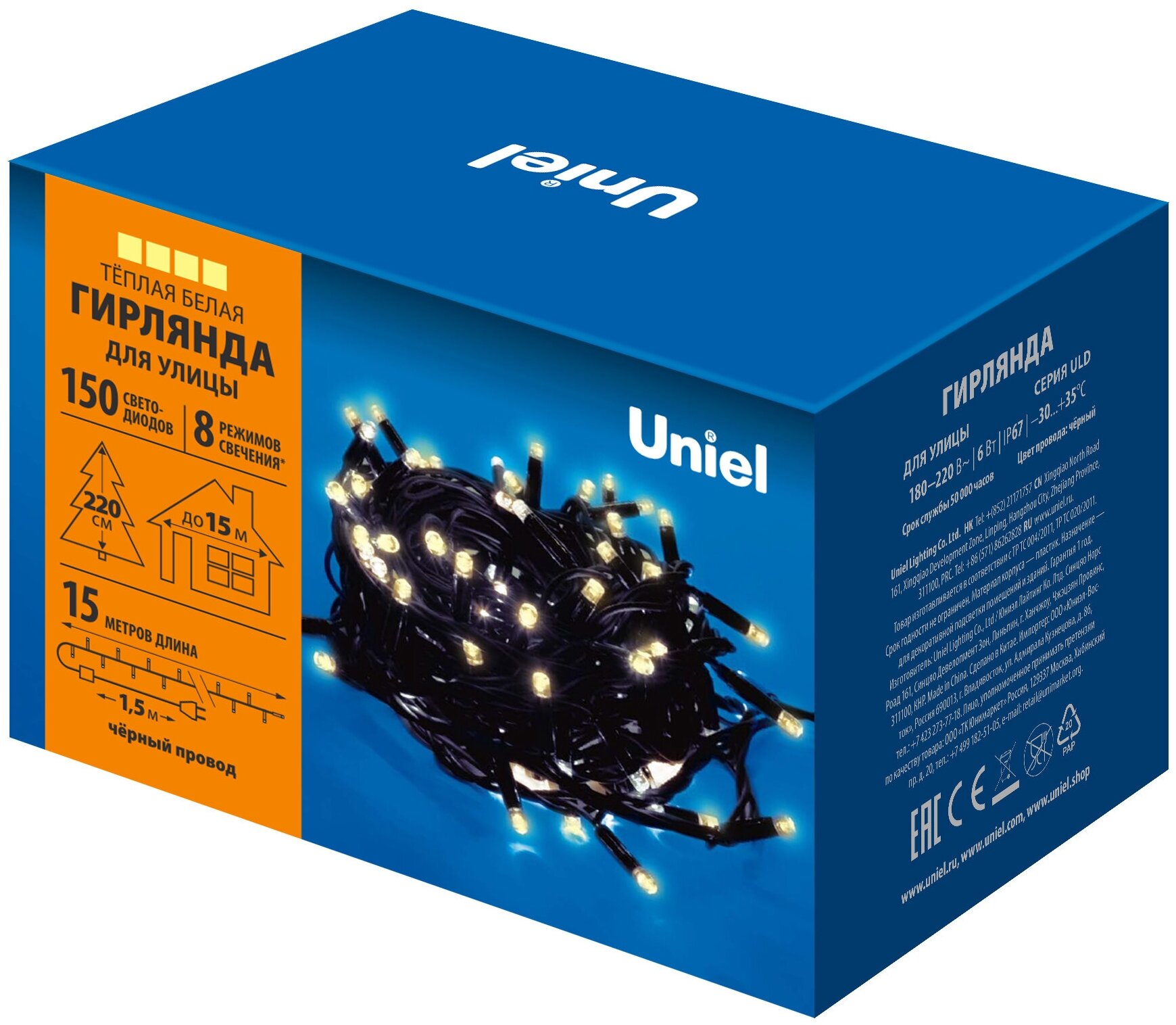 Сервис сравнения цен СкидкаГИД предлагает сравнить цены на товар «Электрогирлянда универсальная Uniel Нить 15м 150 ламп теплый белый 8 режимов работы ULD-S1500-150/DBA»