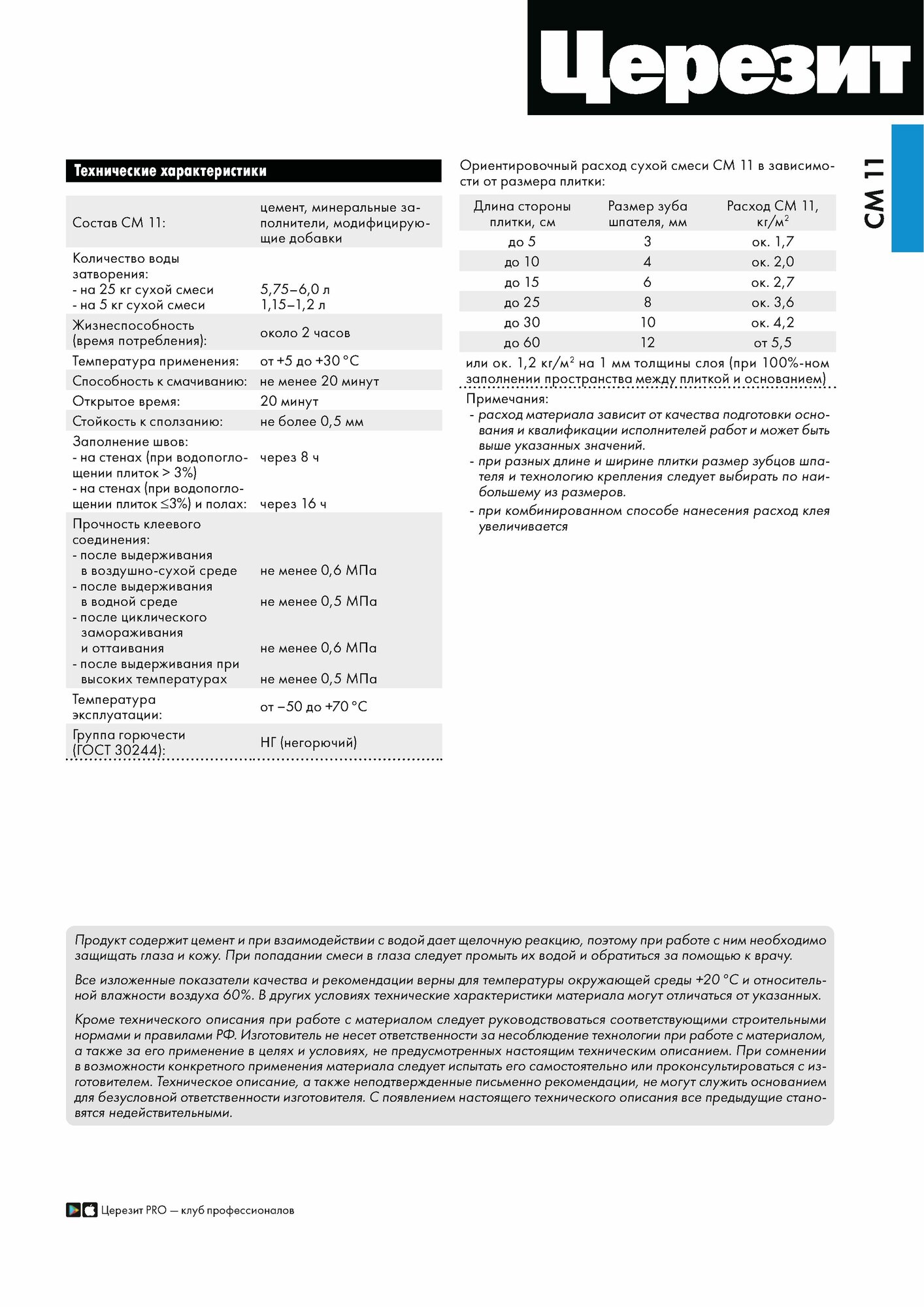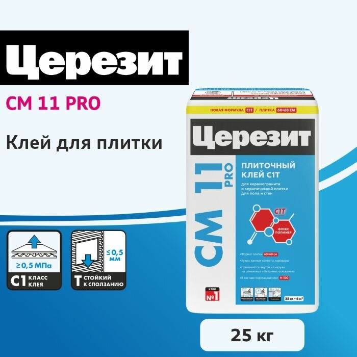 Ceresit CM 11 PRO - смесь сухая строительная клеевая для керамической плитки для пола и стен C0 T, ГОСТ Р 56387-2018.СвойстваВодо- и морозостойкий; высокая стойкость к сползанию; подходит для влажных зон; совместим с гидроизоляцией Ceresit CR 65; пригоден только для внутренних работ; экологически безопасен.Область применения Клей СМ 11 предназначен для крепления керамических плиток размером до 50х50 см на полах и стенах внутри зданий. Рекомендован для применения на минеральных недеформирующихся основаниях: бетоне, цементных стяжках, цементных и цементно-известковых штукатурках и т. п. Пригоден для устройства плиточных облицовок на покрытии из гидроизоляционной смеси CR 65. С добавлением эластификатора СС 83 может применяться для крепления плиток с водопоглощением менее 5% (керамогранит), для наружных работ, для устройства облицовок на покрытиях из гидроизоляционных материалов CR 166 и CL 51, стяжках с подогревом, цоколях, парапетах, наружных лестницах, входных группах, полах балконов и террас, эксплуатируемых кровлях, существующих керамических и каменных облицовках, деформирующихся основаниях (гипсокартоне, ГВЛ, ДСП, OSB), прочных малярных покрытиях, гипсовых и ангидритных основаниях, легком, ячеистом и «молодом» (≥ 1 месяца) бетоне, в крытых и открытых бассейнах и т. д.Этапы работ Подготовка основания Основание должно отвечать требованиям СП 71.13330.2017 и обладать достаточной несущей способностью. Очистить основание от пыли, жиров, битума и других веществ, снижающих адгезию клея. Непрочные участки и отслоения следует удалить. Неровности до 5 мм можно выровнять этой же клеевой смесью не менее чем за 1 сутки до крепления плиток. Неровности свыше 5 мм следует выровнять подходящей штукатурной или напольной смесью Ceresit. Приготовление смеси Для приготовления смеси берут отмеренное количество чистой воды с температурой от +15 до +20°C (или эластификатора CC 83, разбавленного водой в соотношении 2:1). Сухую смесь постепенно добавляют в жидкость при перемешивании, добиваясь получения однородной массы без комков. Перемешивание производят миксером или дрелью с насадкой при скорости вращения 400-800 об/мин. Затем выдерживают технологическую паузу около 5 минут для созревания смеси и перемешивают еще раз. Нанесение раствора Клей наносят на основание гладким шпателем и профилируют гребенчатую структуру зубчатым шпателем. Размер зубцов выбирают в зависимости от размера плиток. При наружных работах и при креплении плиток крупного размера рекомендуется дополнительно нанести тонкий сплошной слой клея на монтажную поверхность плиток («комбинированный способ»). Плитки не замачивать! Плитку укладывают на клей и прижимают не позднее 15 (20*) минут после его нанесения, пока клей липнет к рукам. Положение плитки можно корректировать в течение 20 (25*) минут после укладки. Площадь адгезионного контакта после прижатия плитки должна быть не менее 65% на стенах и 80% на полах. Нельзя укладывать плитки.