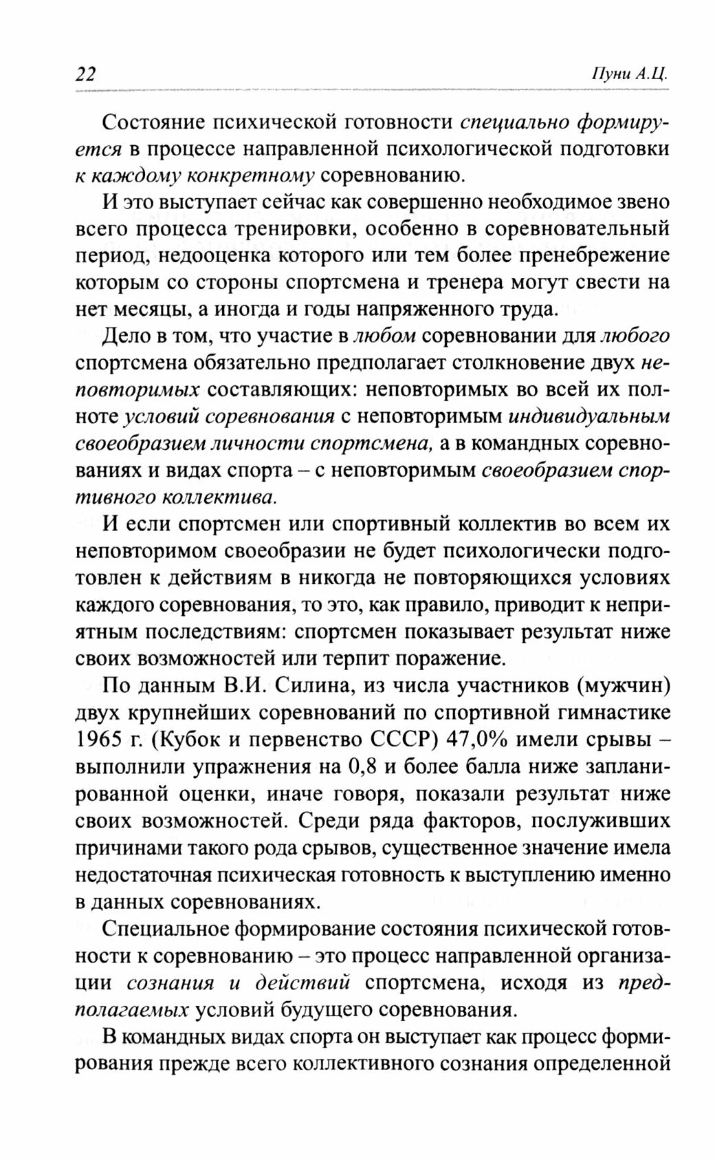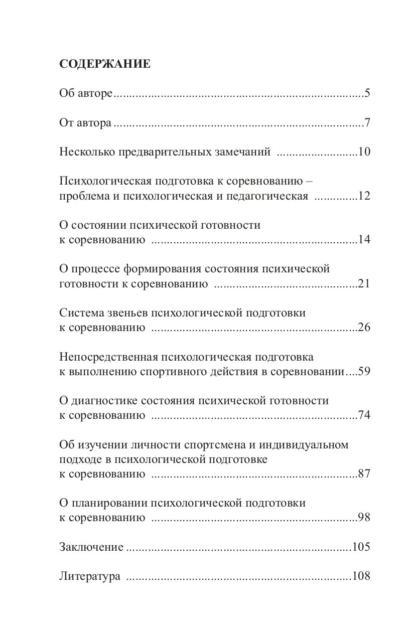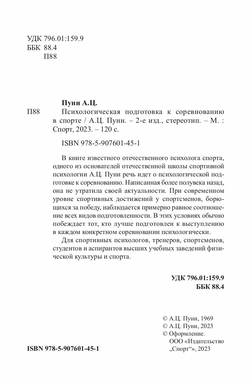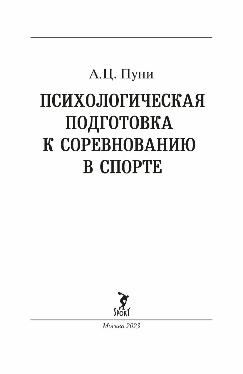 В книге известного отечественного психолога спорта, одного из основателей отечественной школы спортивной психологии А.Ц. Пуни речь идет о психологической подготовке к соревнованию. Написанная более полувека назад, она не утратила своей актуальности. При современном уровне спортивных достижений у спортсменов, борющихся за победу, наблюдается примерно равное соотношение всех видов подготовленности. В этих условиях обычно побеждает тот, кто лучше подготовлен к выступлению в каждом конкретном соревновании психологически.
