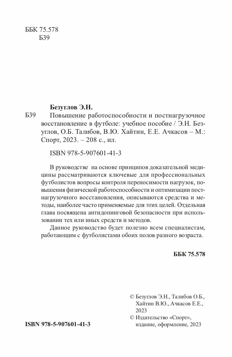 Повышение работоспособности и постнагрузочное восстановление в футболе (Безуглов Э.Н.,Талибов О.Б.,Хайтин В.Ю.,Ачкасов Е.Е.); Спорт, 2023