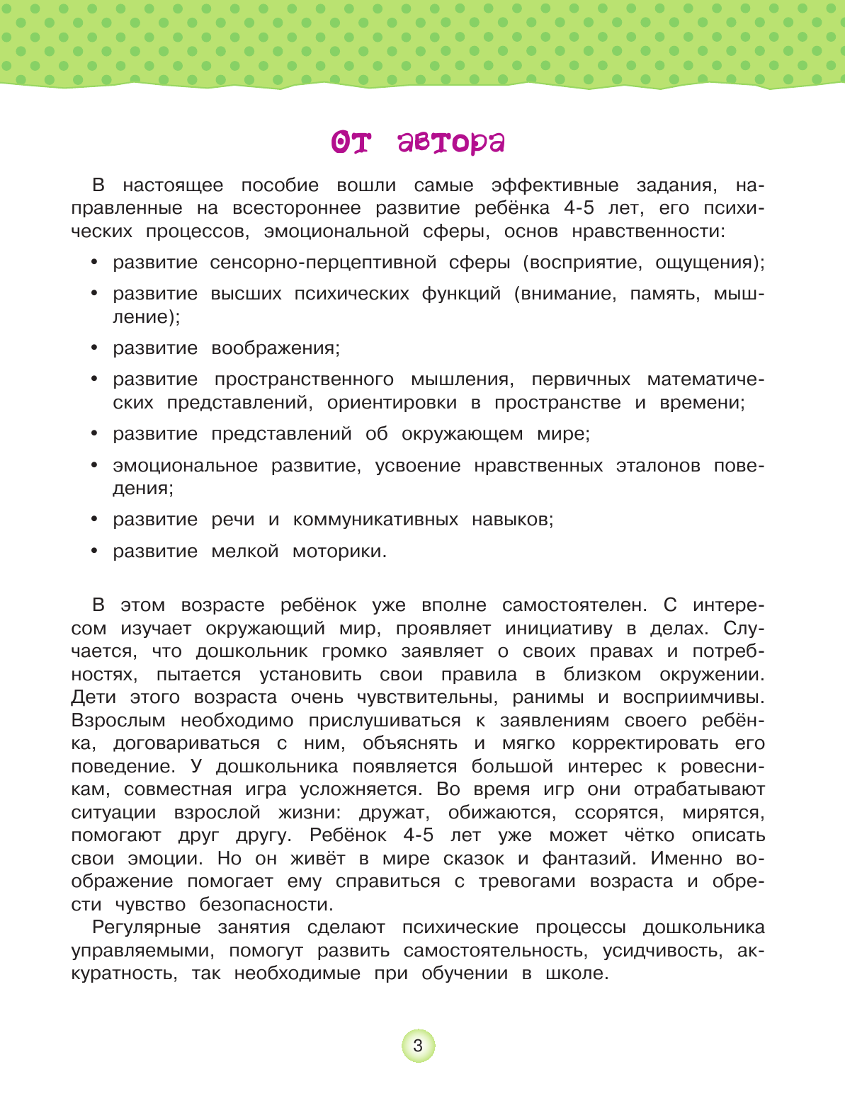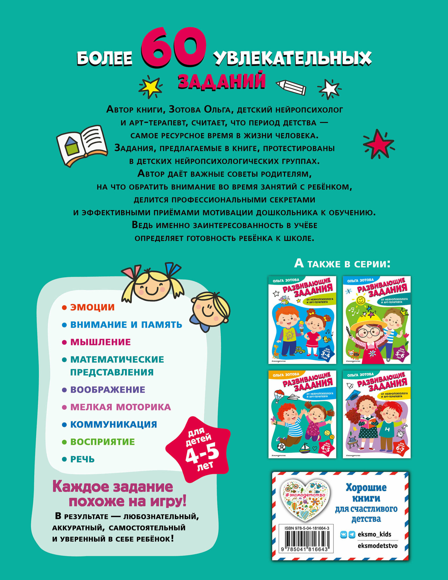 В книге собраны самые интересные задания для комплексного развития ребёнка 4—5 лет. Каждое упражнение станет для дошкольника увлекательной игрой, а для родителей — драгоценными минутами общения со своим ребёнком. Дошкольник закрепит знание базовых цветов и некоторых математических понятий: форма, размер, количество, длина, вес, время. Научится сортировать предметы по разным признакам, определять их положение в пространстве. Расширит словарный запас и напишет свои первые слова. Потренируется распознавать эмоции и отличать хорошие поступки от плохих. Развивающие задания нейропсихологической направленности помогут ребёнку научиться удерживать внимание, эффективно запоминать увиденное и услышанное, логически мыслить, фантазировать и развить мелкую моторику рук. Автор книги для детей — Ольга Зотова, опытный детский нейропсихолог и арт-терапевт, делится профессиональными секретами мотивации дошкольника к обучению, даёт полезные советы для родителей, на что стоит обратить внимание при поэтапном развитии психических функций ребёнка. Все задания протестированы в детских нейропсихологических группах, подходят как для индивидуальных занятий с дошкольником, так и для работы в детском саду.