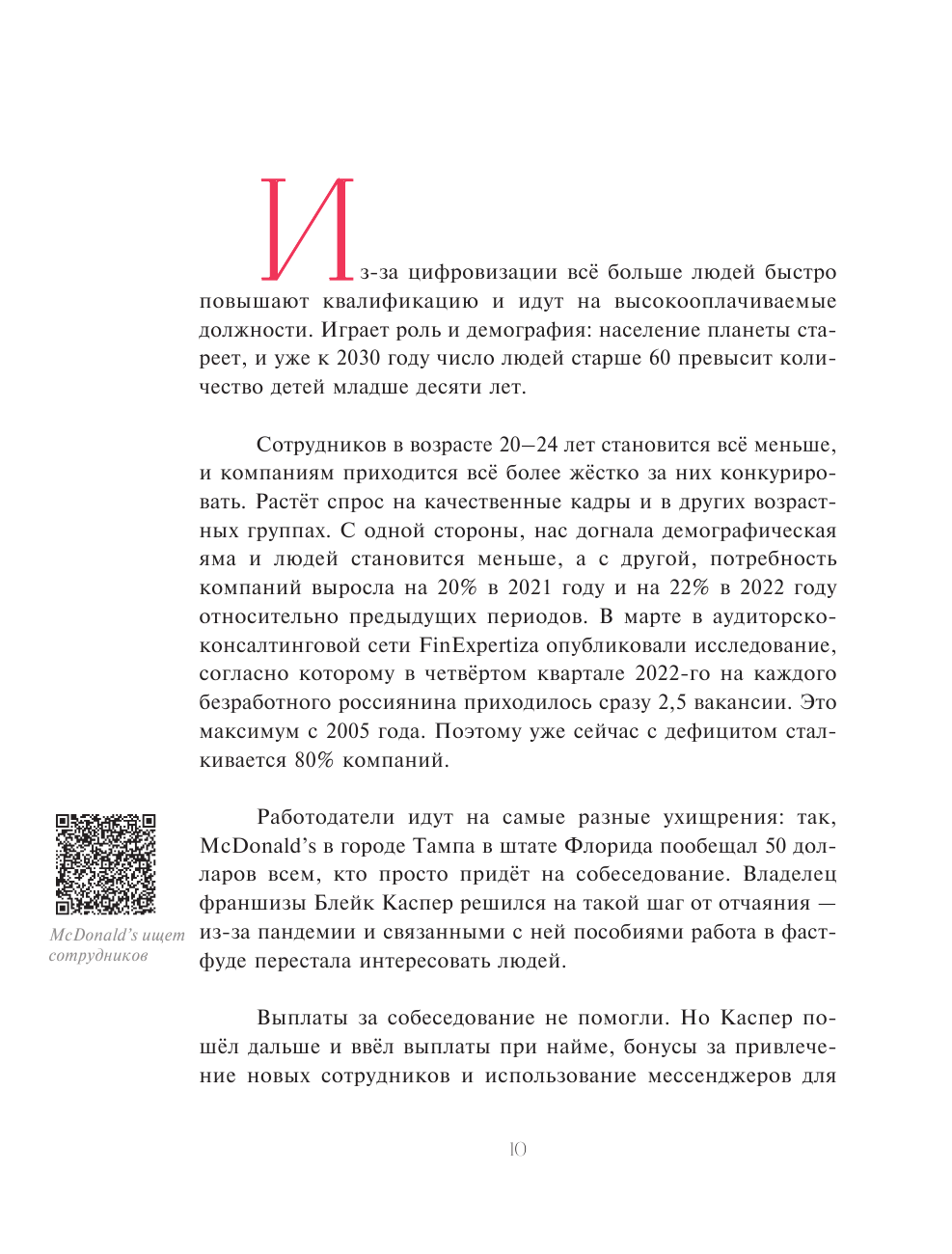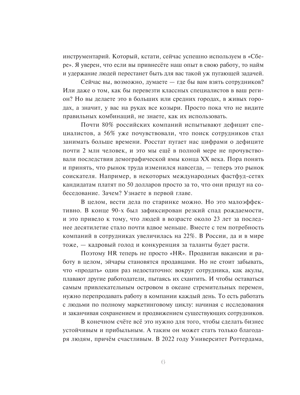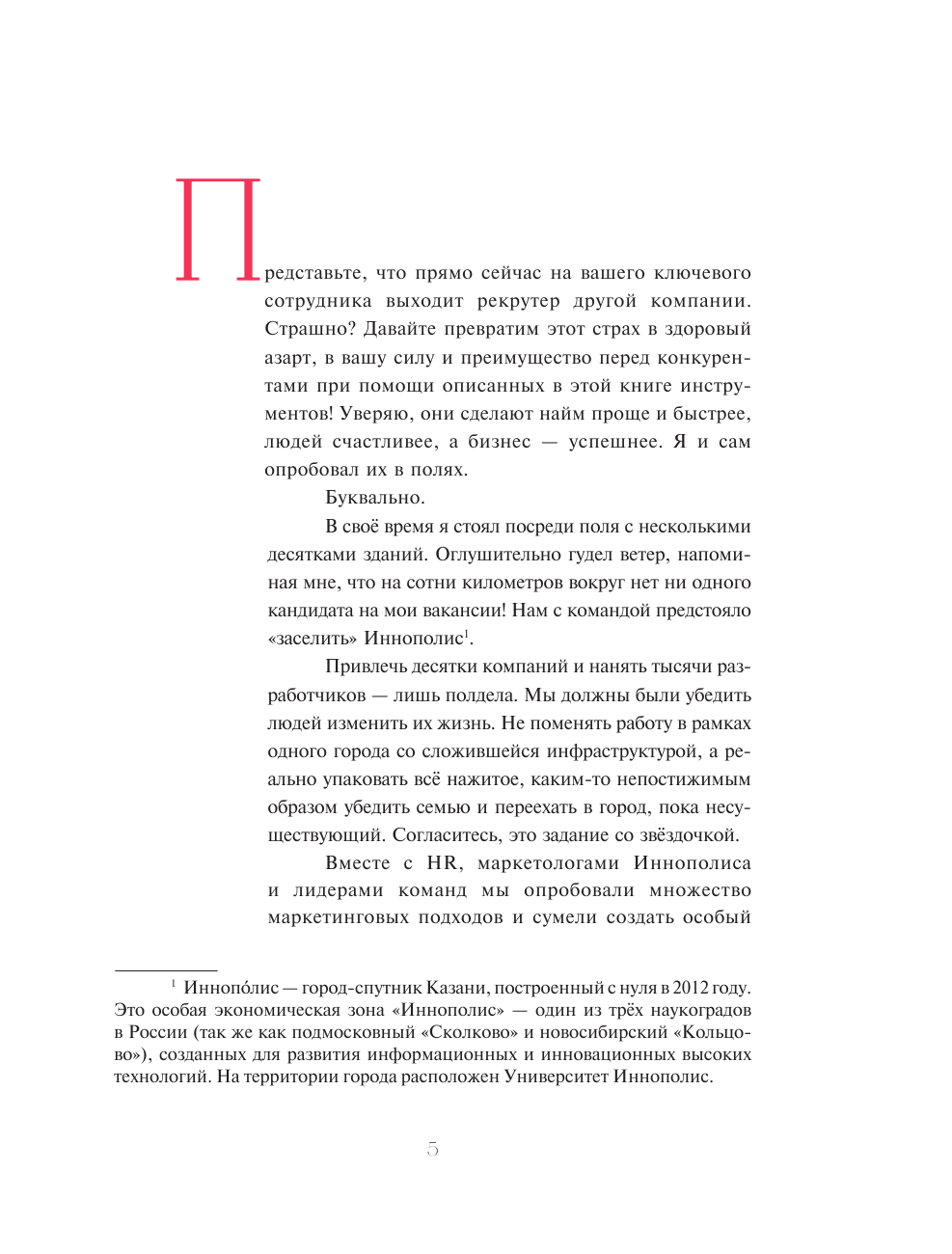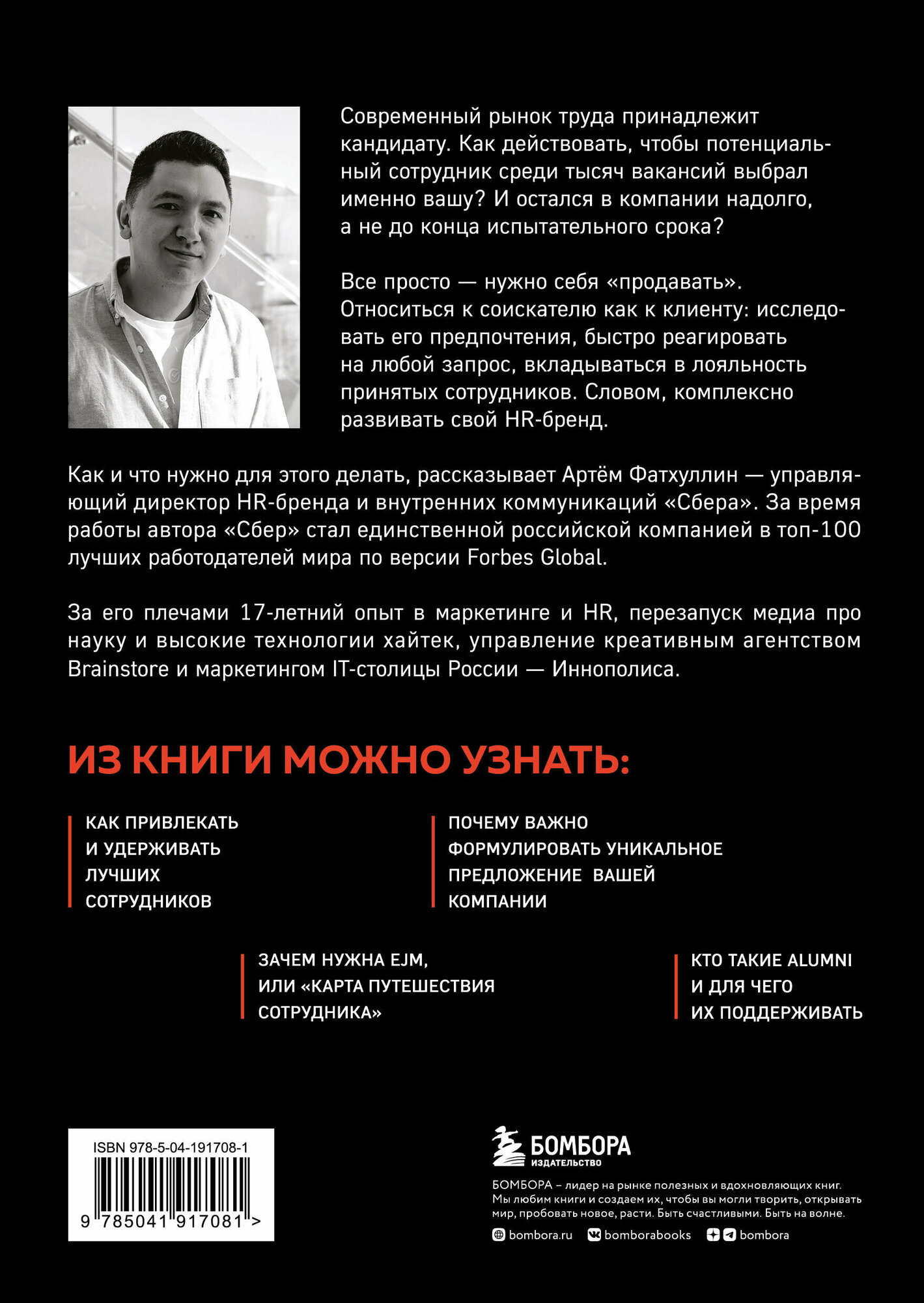 Современный рынок труда принадлежит кандидату. Как действовать, чтобы потенциальный сотрудник среди тысяч вакансий выбрал именно вашу? И остался в компании надолго, а не до конца испытательного срока? Все просто — нужно себя «продавать». Относиться к соискателю как к клиенту: исследовать его предпочтения, быстро реагировать на любой запрос, вкладываться в лояльность принятых сотрудников. Словом, комплексно развивать свой HR-бренд. Как и что нужно для этого делать, рассказывает Артём Фатхуллин — управляющий директор HR-бренда и внутренних коммуникаций Сбера. За время работы автора Сбер стал единственной российской компанией в Топ-100 лучших работодателей мира по версии Forbes Global. За его плечами более чем 17-летний опыт в маркетинге и HR, перезапуск медиа про науку и высокие технологии Хайтек, управление креативным агентством Brainstore и маркетингом IT-столицы России — Иннополисом. Из книги можно узнать: • как привлекать и удерживать лучших сотрудников; • зачем нужна EJM, или «карта путешествия сотрудника»; • почему важно формулировать уникальное предложение вашей компании; • кто такие alumni и для чего их поддерживать.