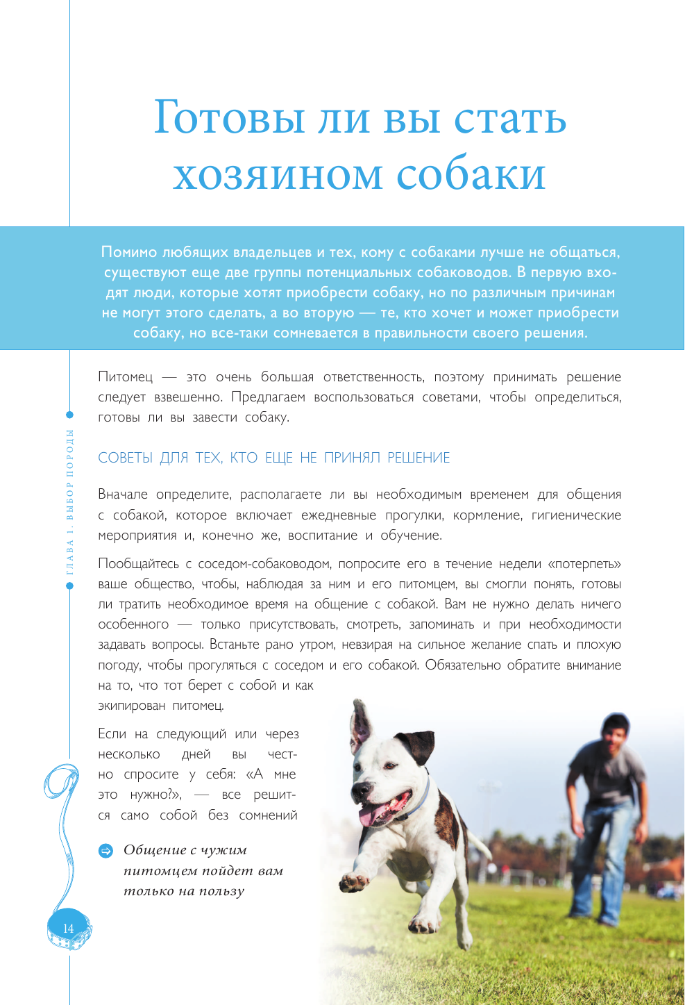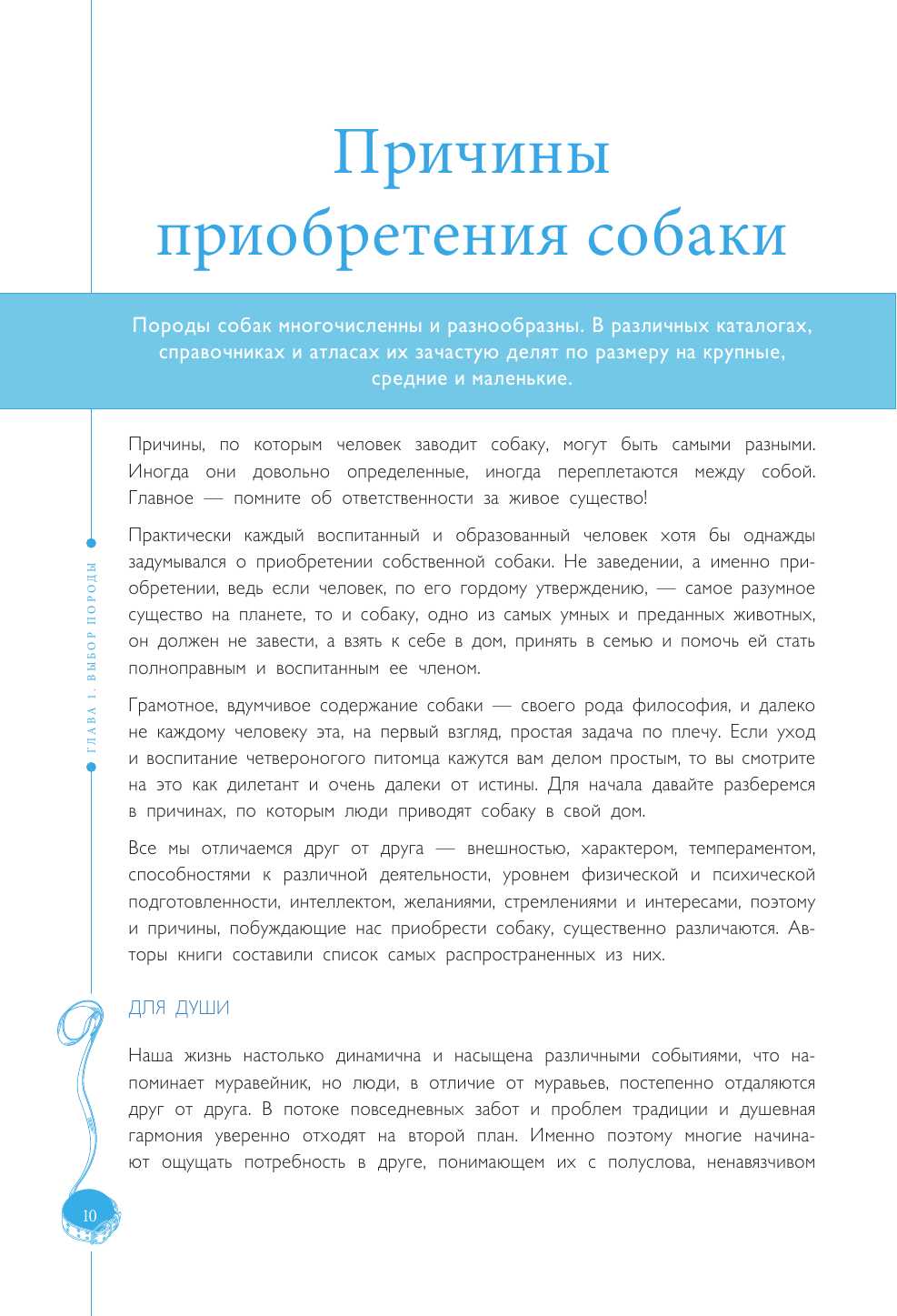 Выбрать из нескольких сотен пород именно ту собаку, которая станет настоящим другом и членом семьи, не так просто. Ведь у каждого владельца свой характер, уровень физической подготовки, жизненные позиции и интересы. В этой книге вы найдете самую важную информацию, которую необходимо знать при выборе питомца: - особенности каждой породы; - методы воспитания и ухода в зависимости от темперамента щенка; - слабые и сильные стороны различных пород. Ведь от этого зависит качество общения и совместного проживания с новым членом семьи. Эта книга поможет обрести нового друга, понять особенности характера 50 самых популярных пород собак, научиться правильно воспитывать и ухаживать за питомцем.
