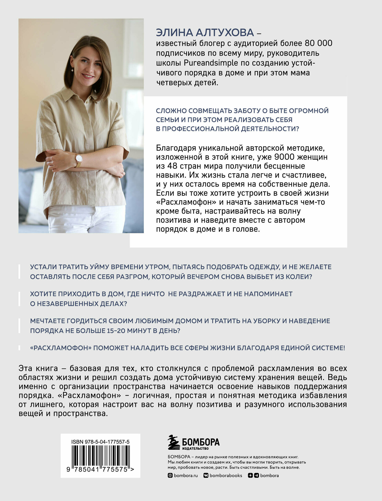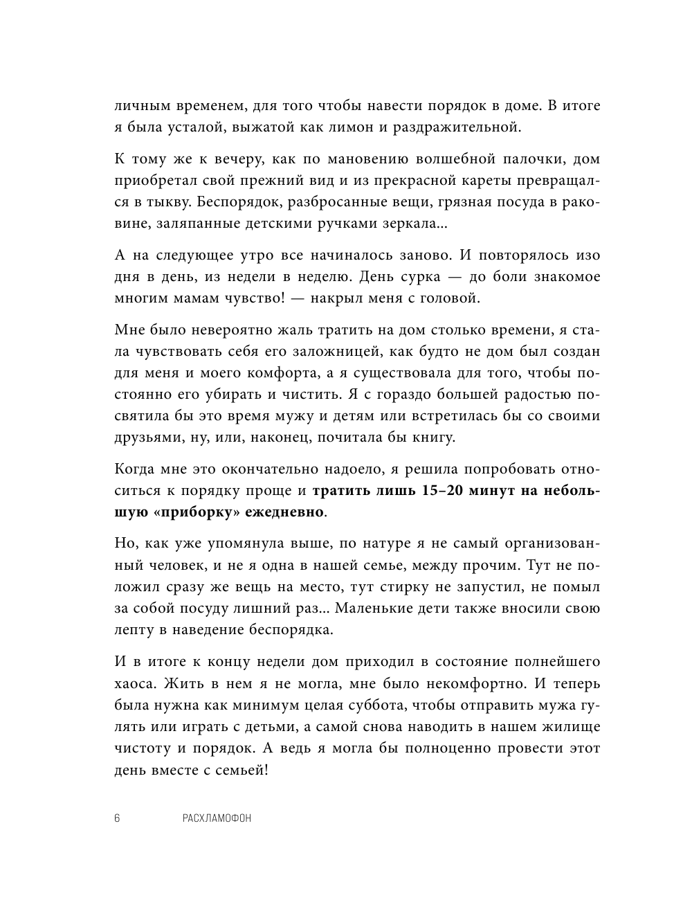Расхламить пространство без нервов, поддерживать постоянный порядок и найти время для семьи и себя, любимой, — мечта каждой женщины. Элина Алтухова — мама четверых детей, первый профессиональный организатор пространства в странах Балтии, руководитель школы «Pure&Simple», известный блогер pureandsimple_org с аудиторией более 80 000 подписчиков по всему миру. Она создала простую и пошаговую систему порядка, которая рассчитана на реальных людей с реальными заботами и проблемами. С помощью этой методики уже более чем 9000 женщин из 48 стран мира навели порядок в своих домах. Если вы тоже хотите устроить в своей жизни «Расхламофон», настраивайтесь на волну позитива и наведите вместе с автором порядок в доме и в голове. Устали тратить уйму времени утром, пытаясь подобрать одежду, и не желаете оставлять после себя разгром? Хотите приходить вечером в дом, где ничто не раздражает и не напоминает о незавершенных делах? Мечтаете гордиться своим любимым домом и тратить на уборку и наведение порядка не больше 15—20 минут в день? «Расхламофон» поможет наладить все сферы жизни благодаря единой системе! Эта книга — базовая для тех, кто столкнулся с проблемой расхламления во всех областях жизни и решил создать дома устойчивую систему хранения вещей. Ведь именно с организации пространства начинается освоение навыков поддержания порядка. «Расхламофон» — логичная, простая и понятная система избавления от лишнего, которая настроит вас на волну позитива и разумного использования вещей и пространства.