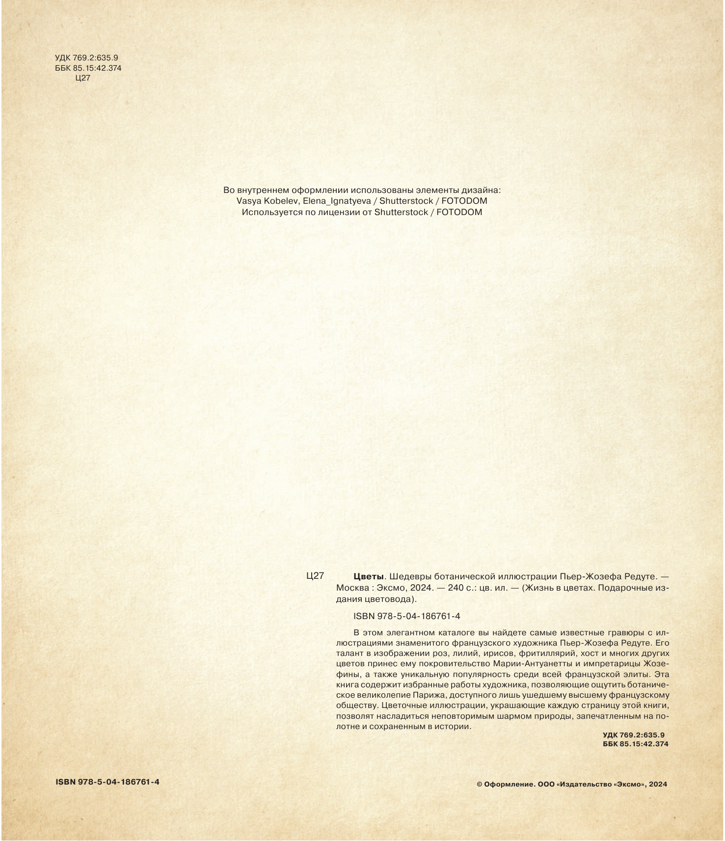 Роскошные розы, шикарные лилии и ирисы — королевы любого сада! Ботанические иллюстрации в исполнении знаменитого французского художника Пьера-Жозефа Редуте — настоящие шедевры в мире искусства. «Рафаэль цветов» — именно так называли современники любимца французского двора XVIII века. Будучи придворным иллюстратором ботанических каталогов королевы Марии-Антуанетты, художник посвятил себя исключительно изображению цветущих растений в акварели, писал живописные цветочные натюрморты для богатых парижских покровителей, при которых нес службу. Главной специализацией Редуте были розы и лилии. Роскошное издание книги «Лилейные» 1802 года остается до сих пор одной из самых дорогих книг в истории. Художник привлек внимание французской элиты XVIII—XIX вв., путешествуя вместе с ботаническими экспедициями и создавая потрясающие иллюстрации для каталогов флоры и фауны Музея естественной истории. Будучи придворным художником Марии-Антуанетты, «Рафаэль цветов» пережил политические бури и благодаря своему таланту получил протекцию жены Наполеона — Жозефины. Эта книга содержит избранные работы художника, позволяющие ощутить ботаническое великолепие прекрасного Парижа прошлого, доступного лишь ушедшему высшему французскому обществу. Окунитесь в мир красоты и изящества, который создал Пьер-Жозеф Редуте, и получите удовольствие от изучения его творений. Цветочные иллюстрации, украшающие каждую страницу этой книги, позволят насладиться неповторимым шармом природы, запечатленным на полотне и сохраненным в истории.