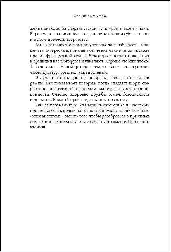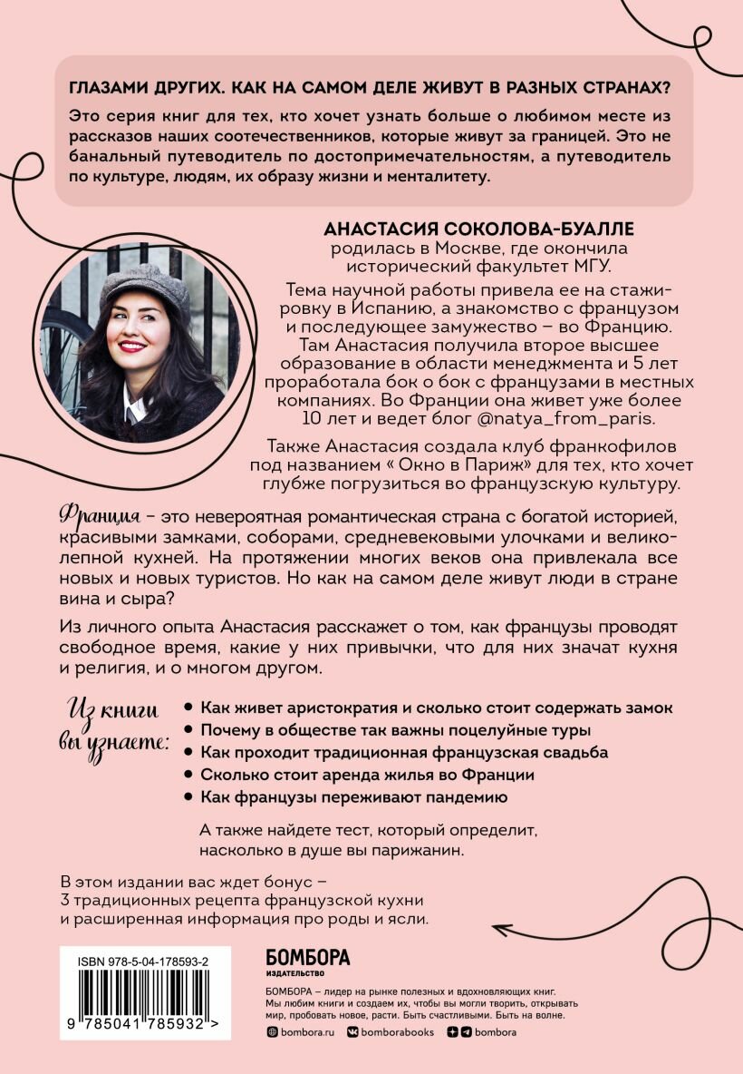 Книга «Франция изнутри» посвящена всем, кто влюблен в страну шарма и легкости и хочет узнать все о быте и нраве французов. Анастасия Соколова-Буалле, гид и историк из Парижа, станет для вас личным проводником и поможет разобраться во всех тонкостях французской культуры. Из книги вы узнаете: • Как живет аристократия и сколько стоит содержать замок? • Почему в обществе так важны поцелуйные туры? • Как проходит традиционная французская свадьба? • Сколько стоит аренда жилья во Франции? • Как французы переживают пандемию? А также найдете тест, который определит, насколько в душе вы парижанин! В дополненном издании автор книги Анастасия Соколова-Буалле расширила информацию про роды и ясли во Франции и актуализировала всю полезную информацию. А еще в книге вас ждут 3 традиционных рецепта французской кухни!