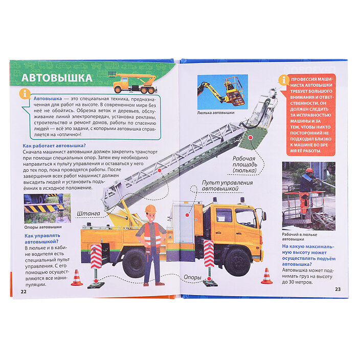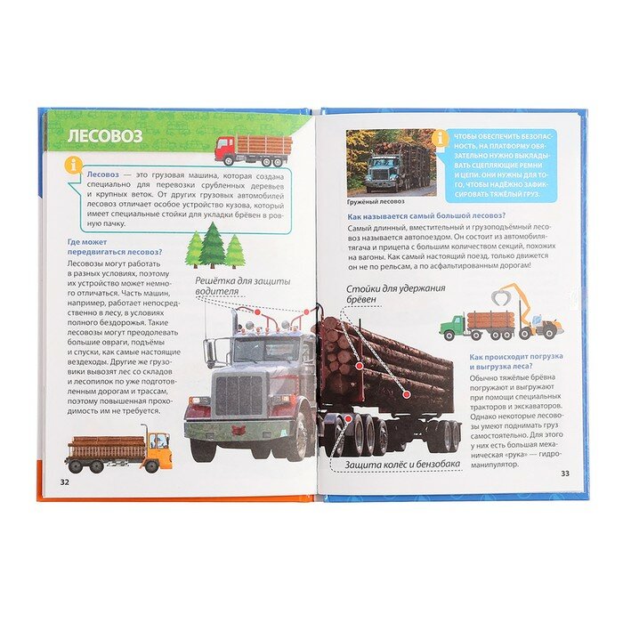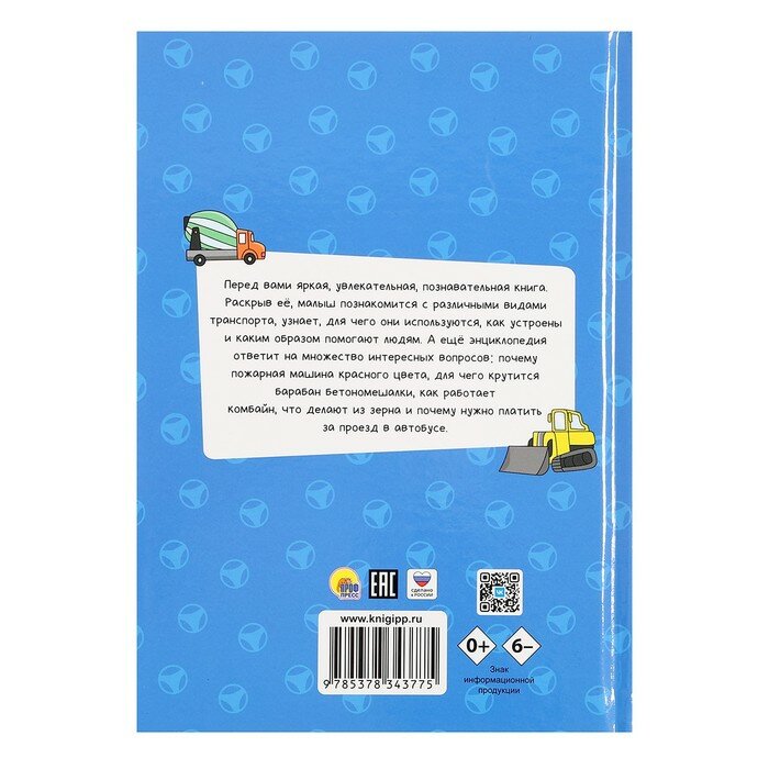 Перед вами яркая, увлекательная, познавательная книга. Раскрыв её, малыш познакомится с различными видами транспорта, узнает, для чего они используются, как устроены и каким образом помогают людям. А ещё энциклопедия ответит на множество интересных вопросов; почему пожарная машина красного цвета, для чего крутится барабан бетономешалки, как работает комбайн, что делают из зерна и почему нужно платить за проезд в автобусе.