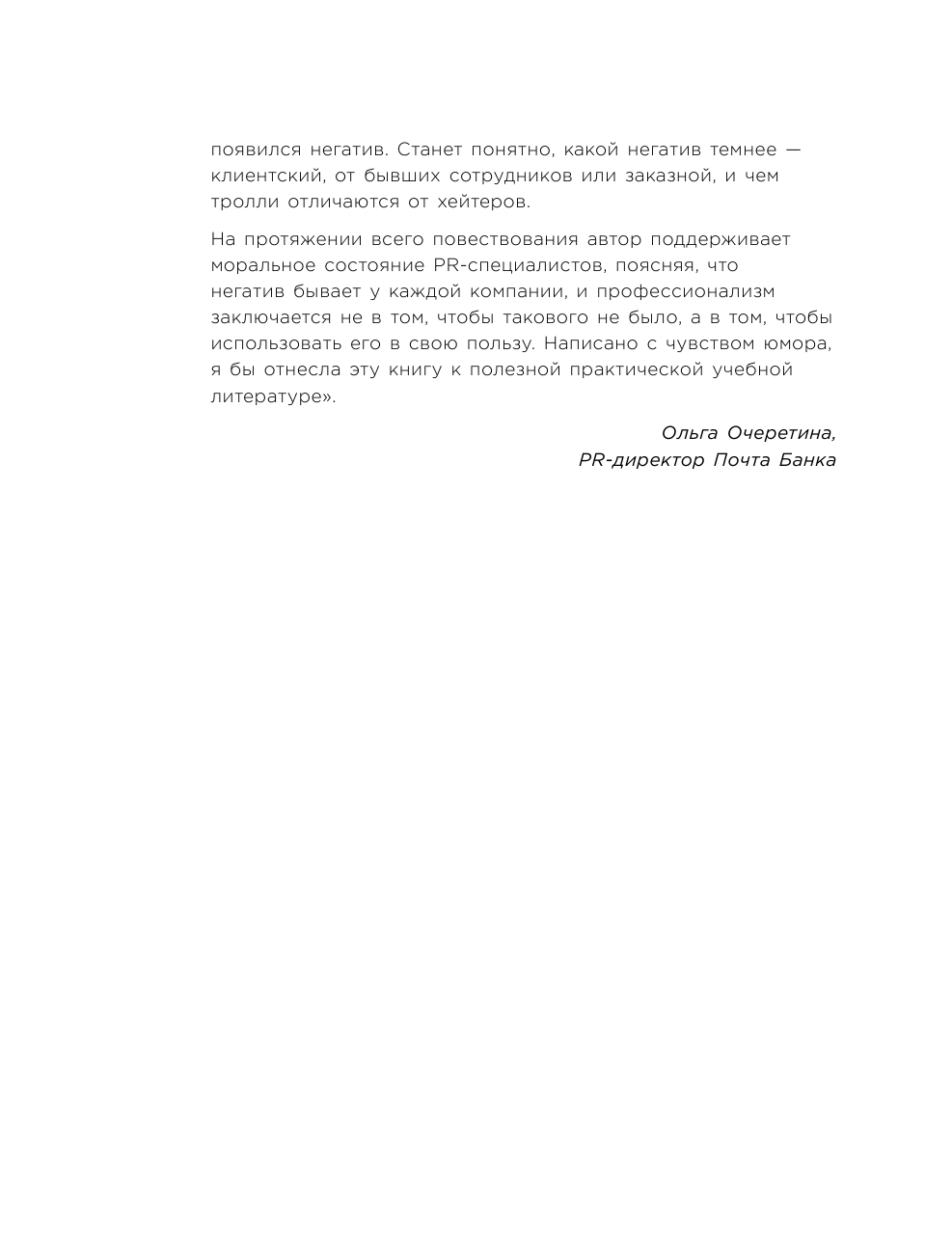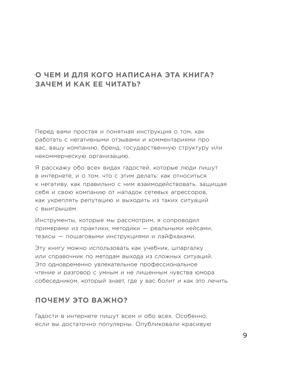 Люди используют отзывы в Сети как оружие против тех, кто им не нравится. Тимур Асланов рассказывает, как от этого защититься и даже улучшить с их помощью свой имидж. Автор делится понятными инструментами, сопровождает их примерами и кейсами из практики — в общем, дает инструкцию по борьбе с сетевым негативом.