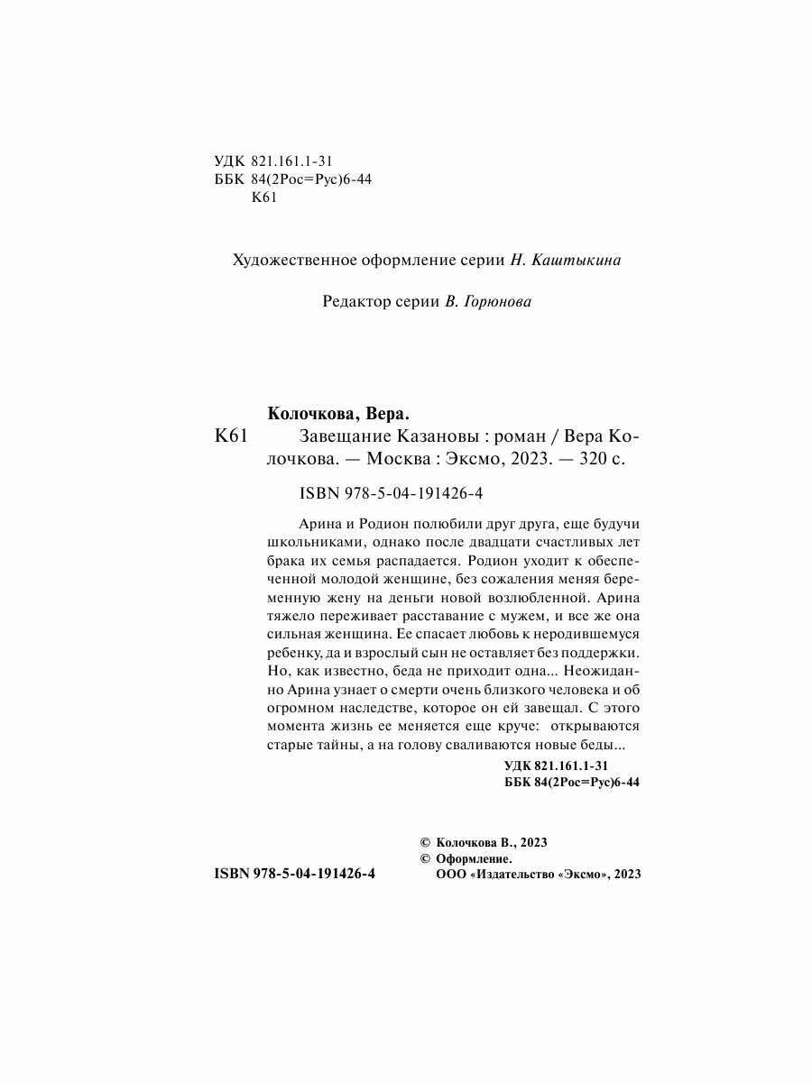 Книга: Завещание Казановы (Колочкова Вера Александровна); Эксмо, Редакция 1, 2023