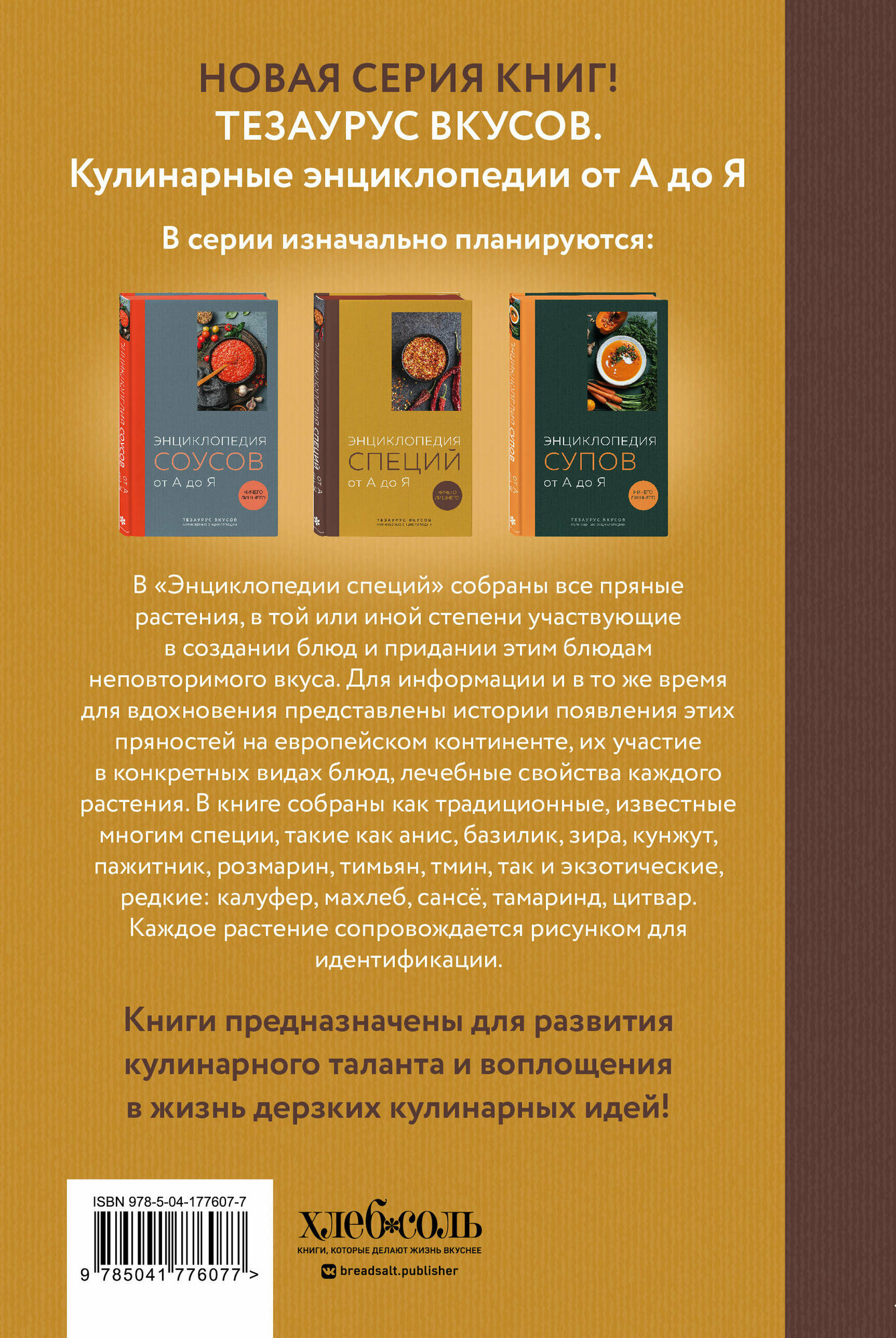 В «Энциклопедии специй» собраны все пряные растения, в той или иной степени участвующие в создании блюд и придании этим блюдам неповторимого вкуса. Для информации и в то же время для вдохновения представлены истории появления этих пряностей на европейском континенте, их участие в конкретных видах блюд, лечебные свойства каждого растения. В книге собраны как традиционные, известные многим специи, такие как анис, базилик, зира, кунжут, пажитник, розмарин, тимьян, тмин, так и экзотические редкие: калуфер, махлеб, сансё, тамаринд, цитвар. Каждое растение сопровождается рисунком для идентификации.