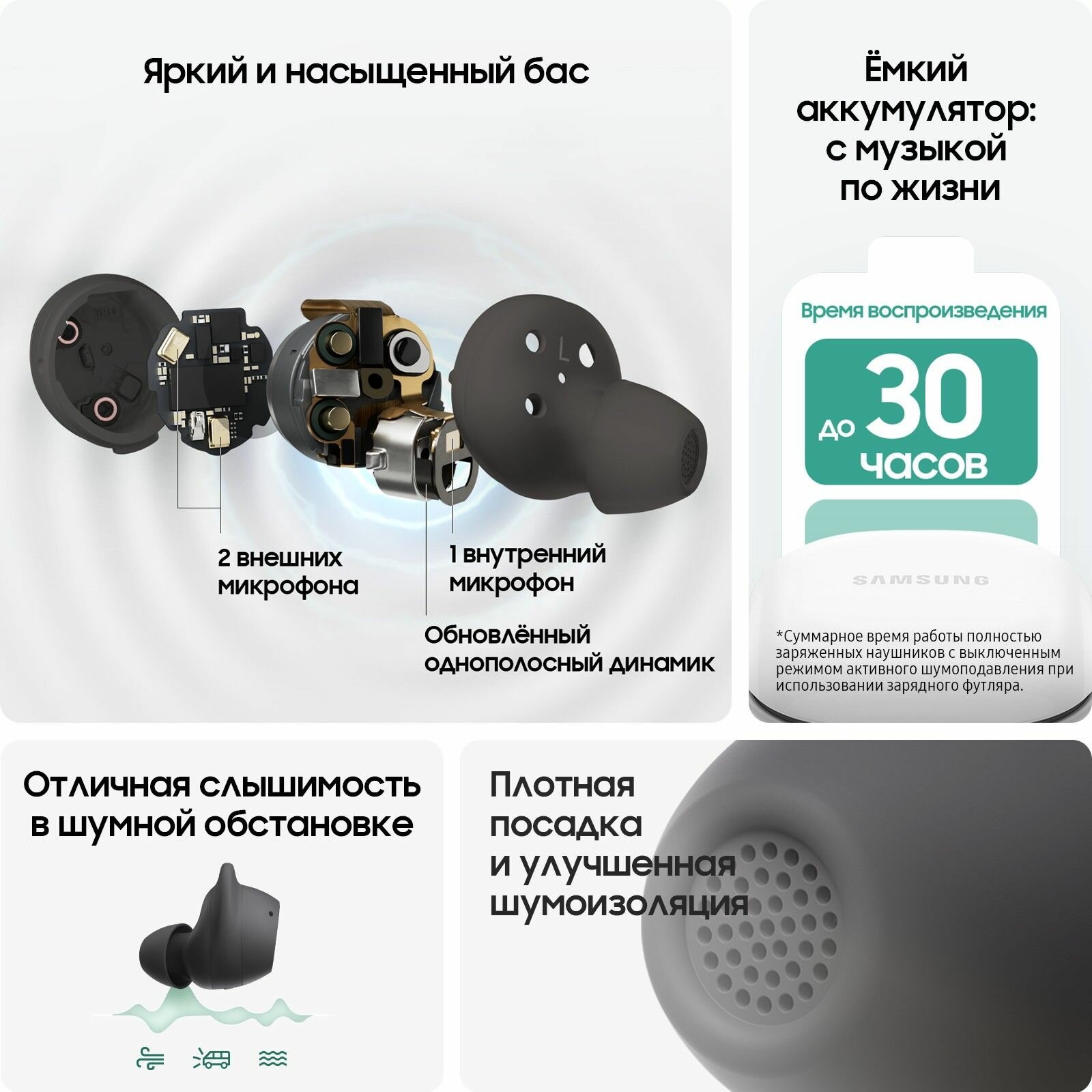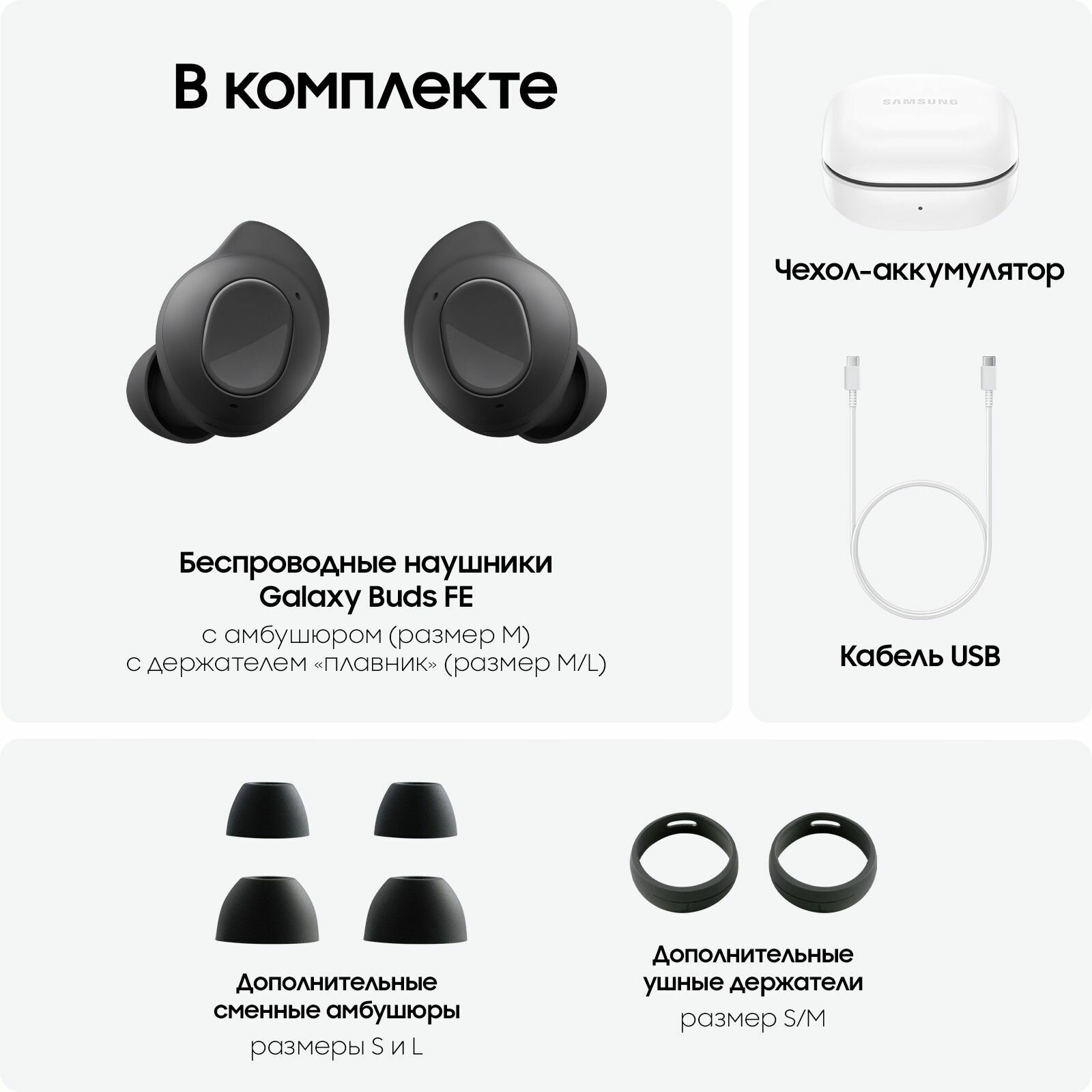Galaxy Buds FE получили аудиосистему собственной разработки Samsung с упором на басы. Поддерживается как проприетарный кодек Samsung, так и стандартные AAC и SBC. Также заявлена поддержка активного шумоподавления. Режима окружающего звука нет. Однако есть система Deep Neutral Network на базе ИИ, отделяющая голос пользователя от окружающего шума, что будет полезно при голосовых вызовах. Каждый наушник Galaxy Buds FE оснастили встроенной батареей на 60 мАч. На одном заряде с отключенным шумоподавлением наушники продержатся до 8,5 часов при проигрывании музыки. С ANC — только 6 часов. Зарядный кейс получил аккумулятор на 479 мАч. Этого хватит примерно на 3,5 зарядки наушников. С подзарядкой от кейса автономность Galaxy Buds FE достигает 30 часов.