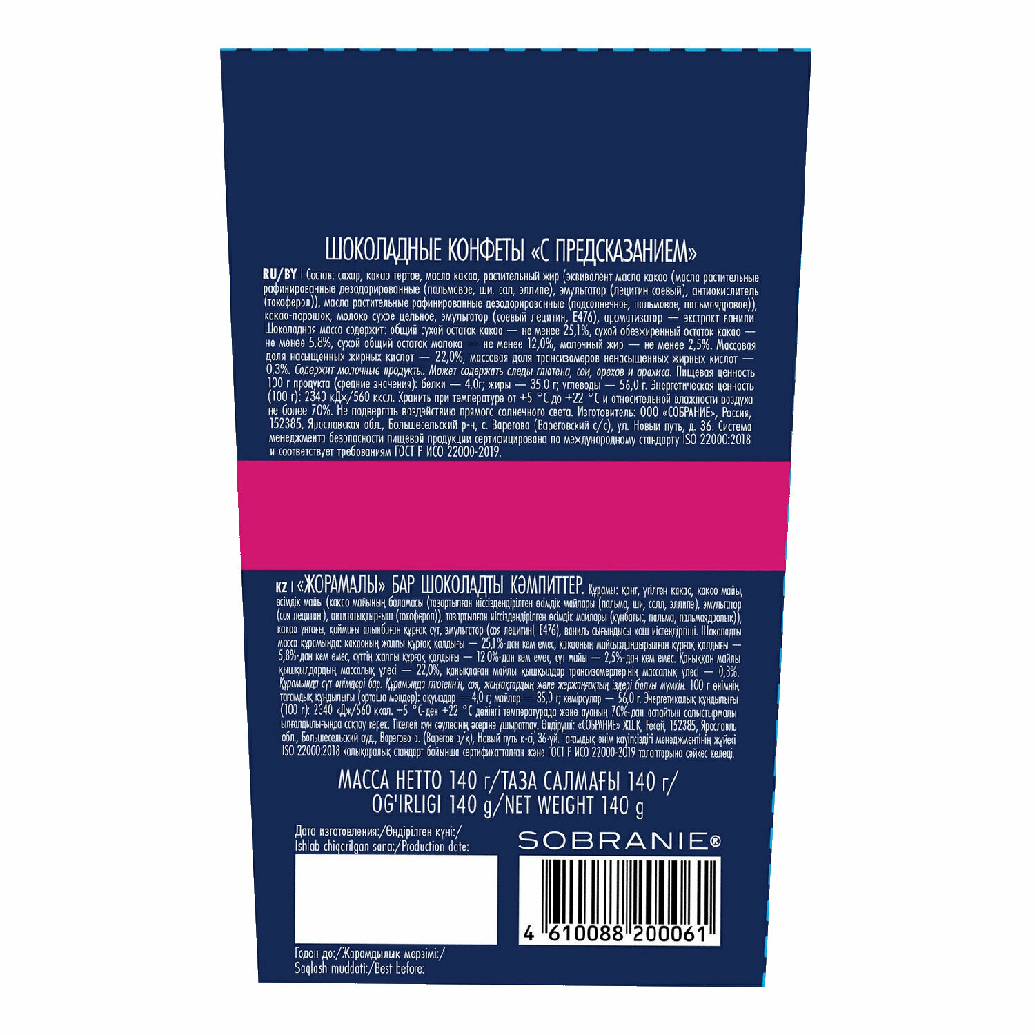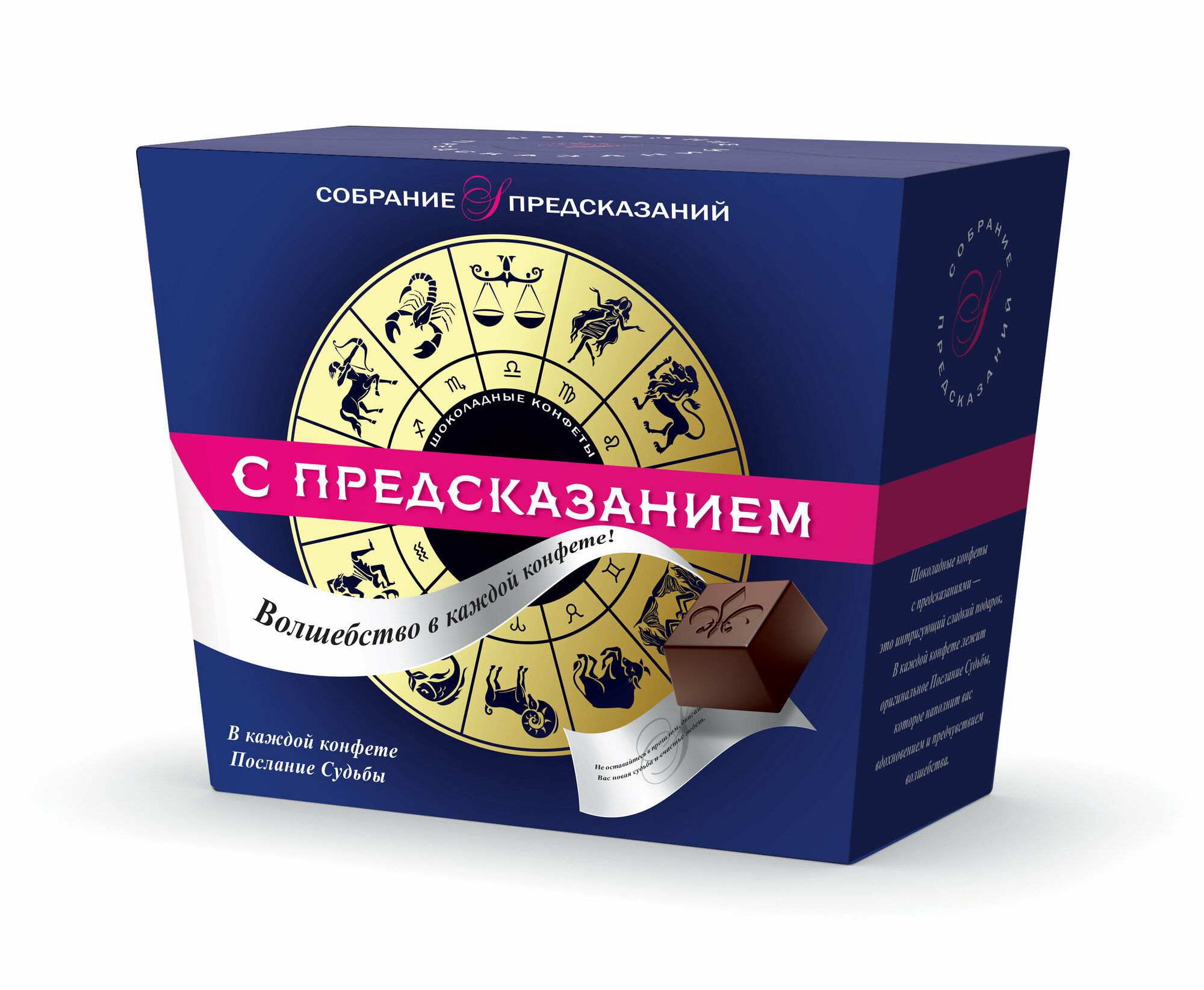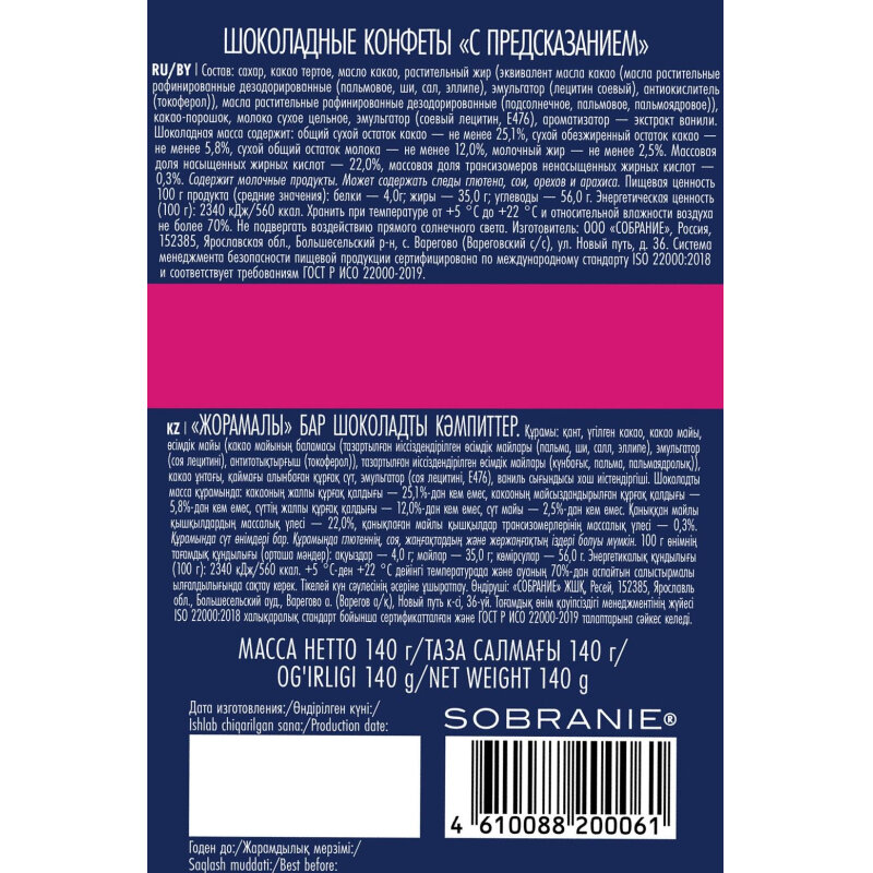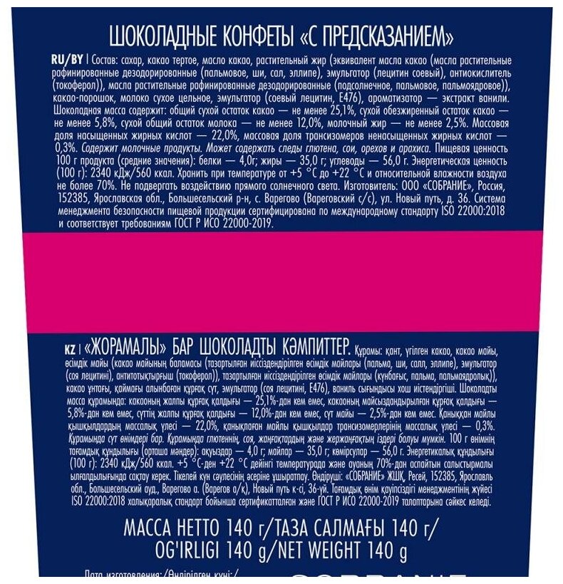 Шоколадные конфеты с предсказаниями - это интригующий сладкий презент, оставляющий послевкусие чуда и возможность превратить любое чаепитие в маленькое шоу. Ароматные и нежные конфеты Sobranie приготовлены из отборных африканских какао-бобов. Каждая из конфет имеет индивидуальную упаковку, внутри которой потребитель найдет оригинальное вдохновляющее предсказание. Состав: сахар, какао тертое, масло какао, растительный жир (эквивалент масла какао (масла растительные рафинированные дезодорированные (пальмовое, ши, сал, эллипе), эмульгатор (лецитин соевый), антиокислитель (токоферол)), масла растительные рафинированные дезодорированные (подсолнечное, пальмовое, пальмоядровое)), какао-порошок, молоко сухое цельное, эмульгатор (соевый лецитин, E476), ароматизатор - экстракт ванили. Шоколадная масса содержит: общий сухой остаток какао - не менее 25,1%, сухой обезжиренный остаток какао - не менее 5,8%, сухой общий остаток молока - не менее 12,0%, молочный жир - не менее 2,5%. Массовая доля насыщенных жирных кислот - 22,0%, массовая доля трансизомеров ненасыщенных жирных кислот - 0,3%. Содержит молочные продукты. Может содержать следы глютена, сои, орехов и арахиса. Пищевая ценность 100 г продукта (средние значения): белки - 4,0 г; жиры - 20,0 г; углеводы - 66,0 г. Энергетическая ценность (100 г): 2340 кДж, 560 ккал. Срок годности: 18 месяцев. Хранить при температуре от 5°C до 22°C и относительной влажности воздуха не более 70%. Не подвергать воздействию прямого солнечного света. Страна производства: Россия.