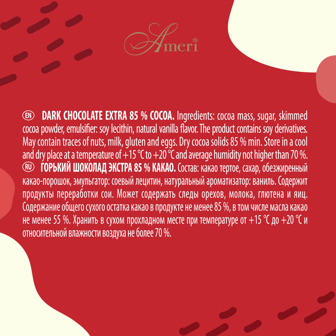 Экстра горький шоколад 85% торговой марки Ameri - это высококачественный бельгийский шоколад с легким добавлением натуральной ванили. При создании плиток бренд использует только лучшие сорта какао и 100% какао масло в сочетании с отборными ингредиентами. Аромат лакомства удивит силой и насыщенностью. Ameri Экстра горький шоколад 85 % отлично гармонирует с черным кофе и крепкими напитками. Хранить шоколадные изделия рекомендуем вдали от прямых солнечных лучей и в помещении с влажностью не более 70% - так продукт не потеряет своих вкусовых качеств.