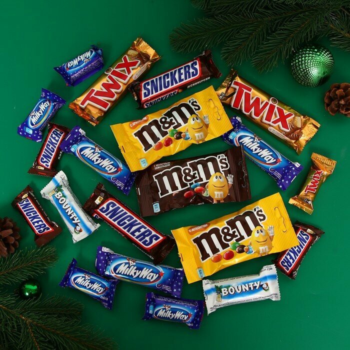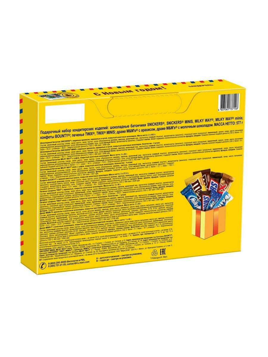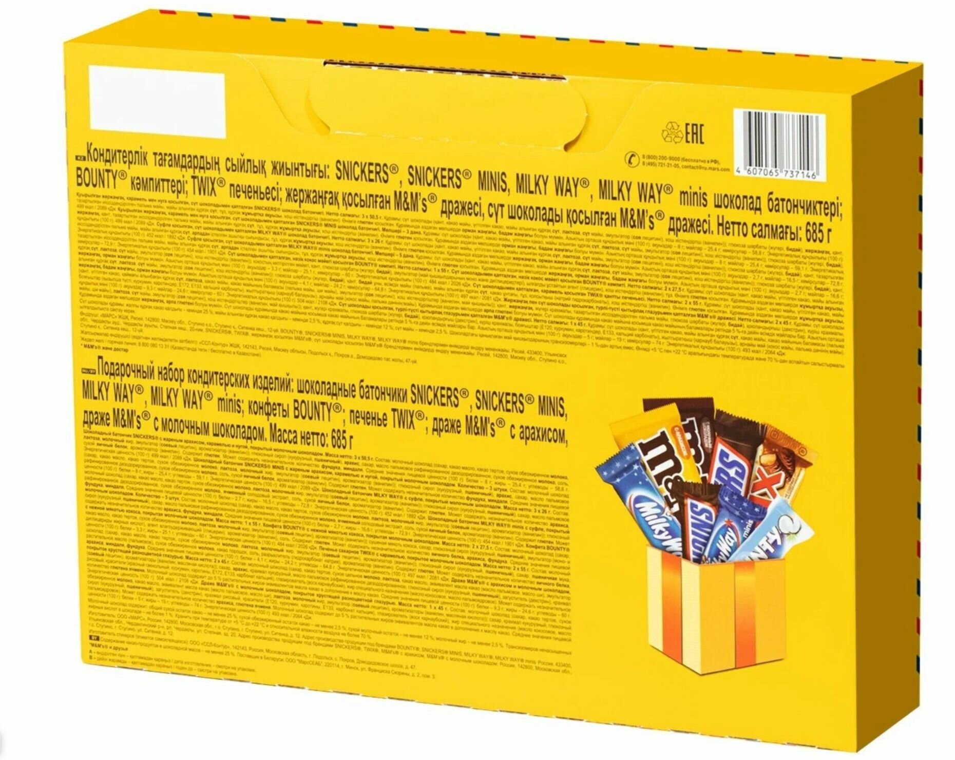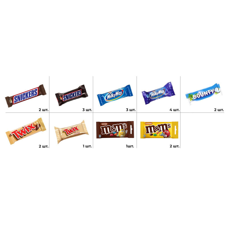 | Состав | шоколадный батончики SNICKERS - 2 шт, SNICKERS minis - 3 шт, MILKY WAY - 3 шт, MILKY WAY minis - 4 шт, конфета BOUNTY - 2 шт, печенье TWIX с карамелью - 2 шт, печенье TWIX minis с карамелью - 1 шт, драже M&Ms с арахисом - 2 шт, драже M&Ms с молочным шоколадом - 1 шт. |