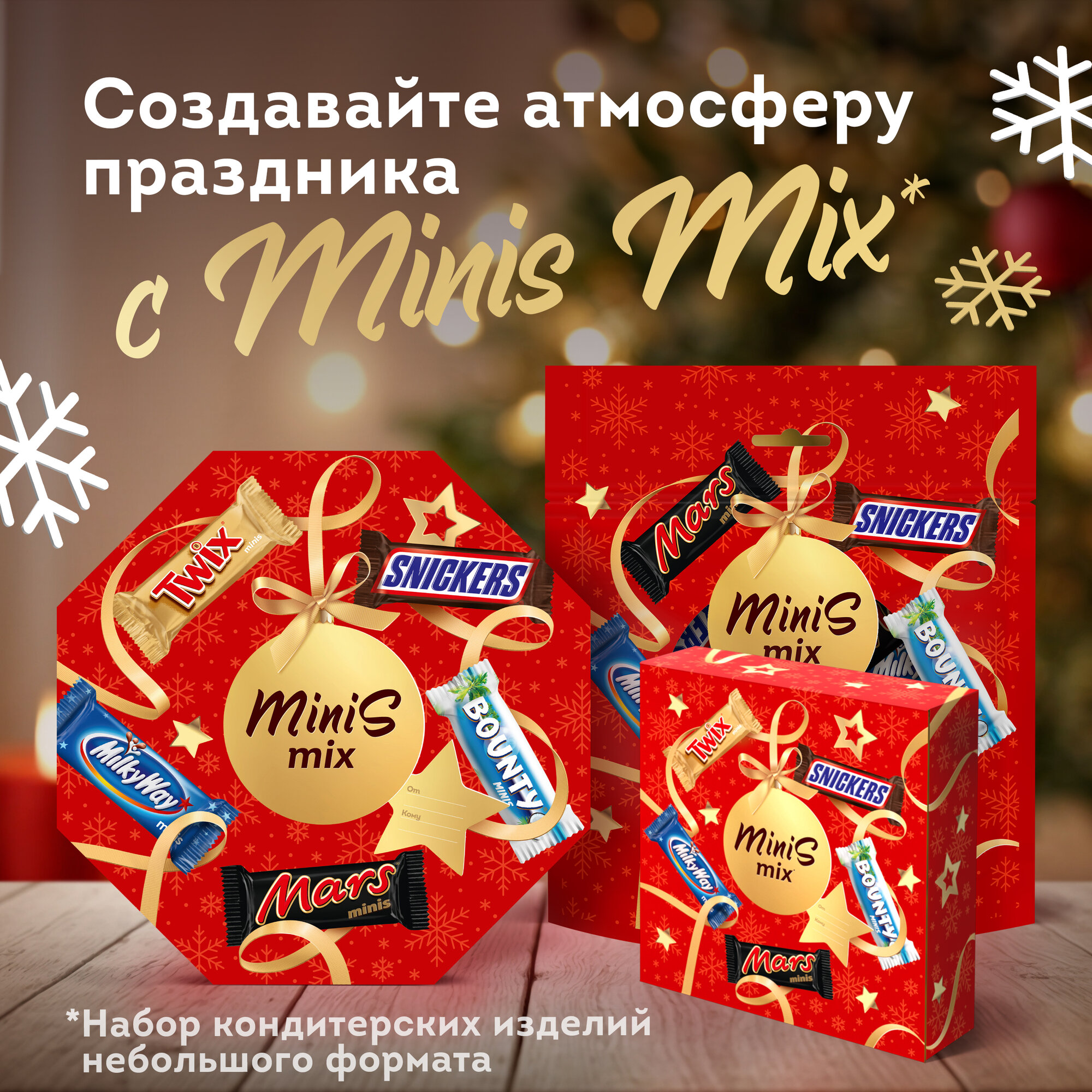 Набор сладостей Minis Mix - отличный подарок для родных, близких и коллег на Новый Год или Рождество 2024. В наборе - только самые любимые мини-кнфеты: Snickers, Twix, Mars, Milky Way и Bounty. Яркая упаковка станет отличным украшением для праздничного стола и подойдет для похода в гости, а с разнообразным составом мини-конфет внутри каждый найдет что-то себе по вкусу!