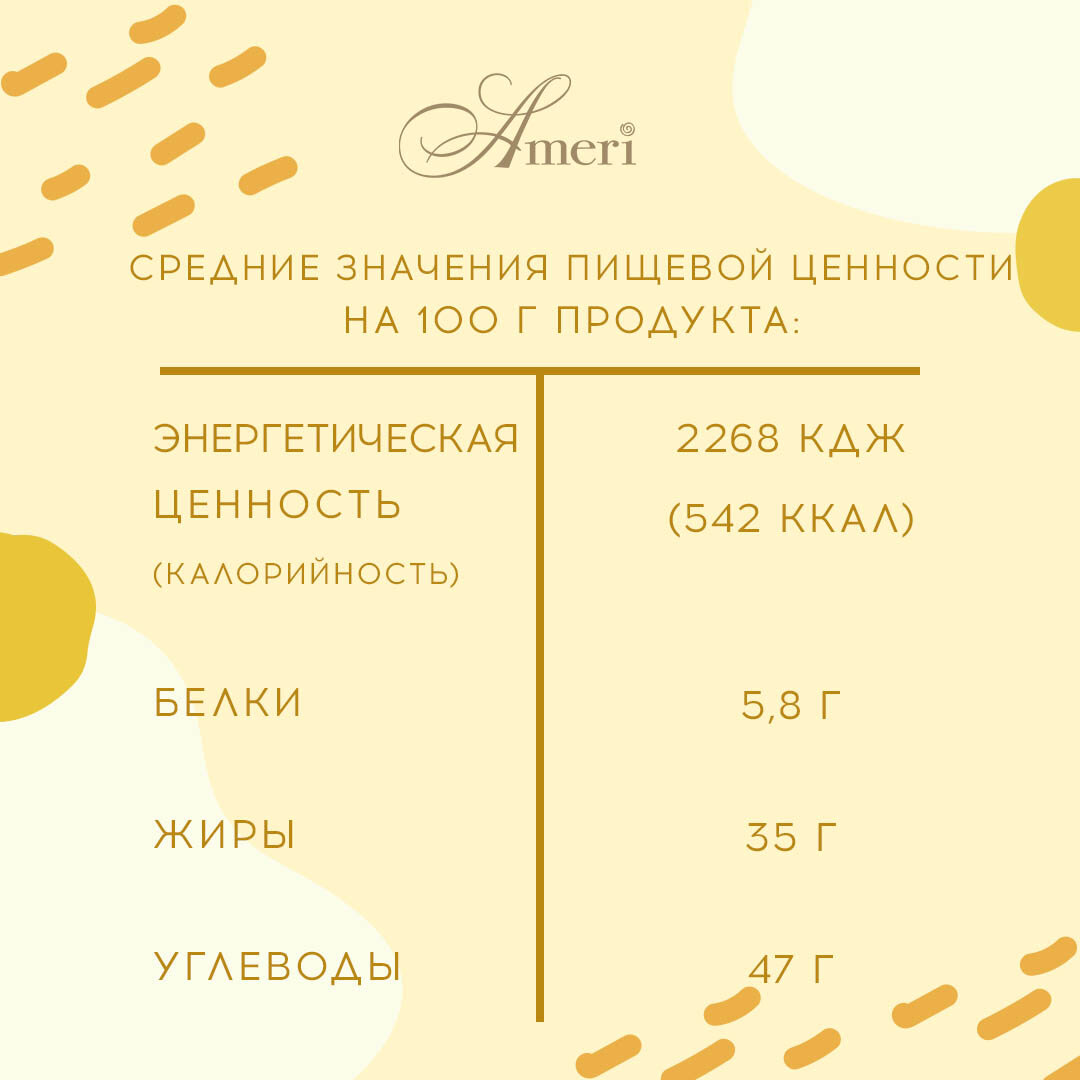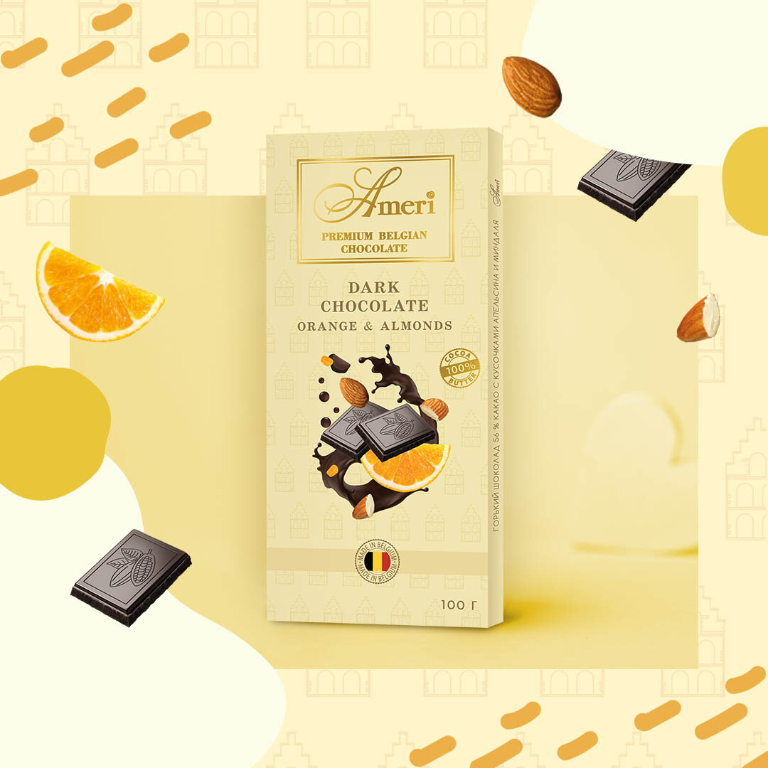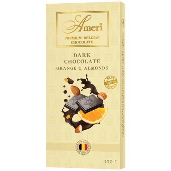 Горький шоколад 56 % с кусочками апельсина и миндаля торговой марки Ameri - это бельгийский шоколад высочайшего качества. При создании плиток используются только лучшие сорта какао и 100% какао масло в сочетании с отборными ингредиентами. Аромат раскрывается букетом благородных оттенков шоколада с апельсиново-миндальными нотками. Горький шоколад 56 % с кусочками апельсина и миндаля торговой марки Ameri отлично гармонирует с черным кофе и крепкими напитками. Хранить шоколадные изделия рекомендуем вдали от прямых солнечных лучей и в помещении с влажностью не более 70% - так продукт не потеряет своих вкусовых качеств.