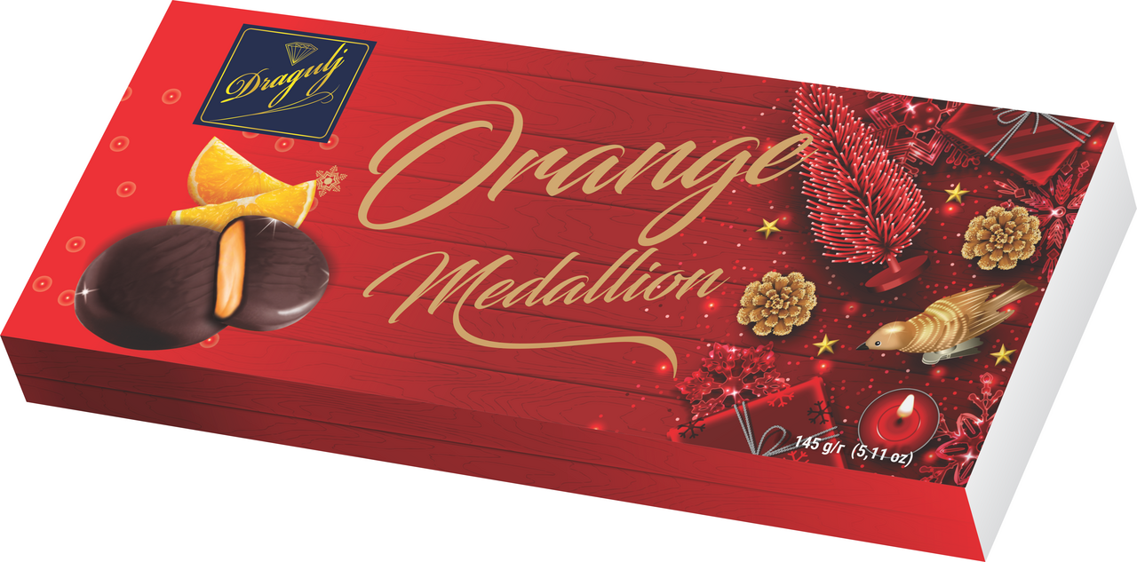 Медальоны шоколадные Dragulj с апельсиновой начинкой - это изысканный деликатес, который придется по вкусу настоящим ценителям шоколада. Благодаря этому сочетанию, вкус шоколада становится еще более насыщенным и ярким, а апельсиновая начинка добавляет приятную кислинку.