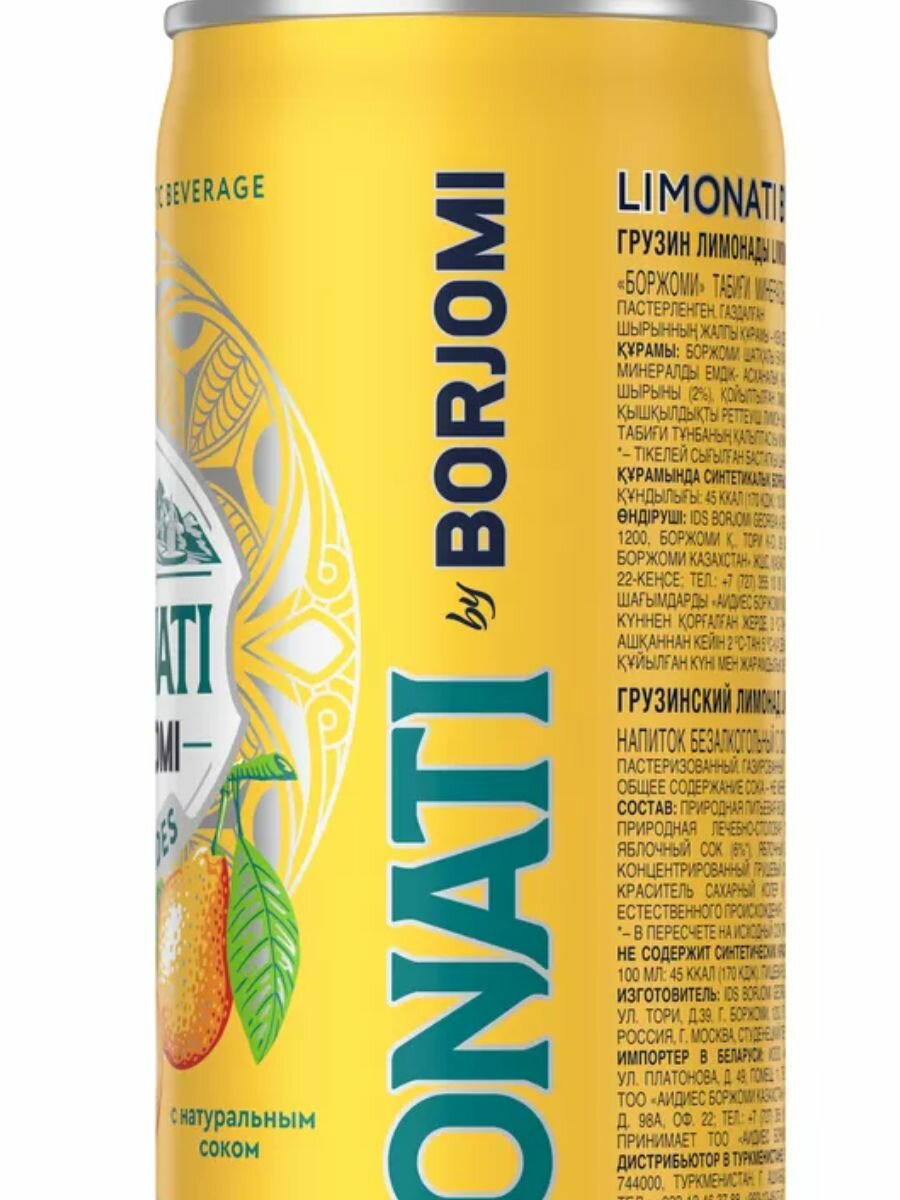 | Состав | Природная питьевая вода из родников Боржомского ущелья, вода минеральная природная лечебно-столовая питьевая «Боржоми», сахар, концентрированный яблочный сок (6%*), яблочный сок (2%), концентрированный лимонный сок (1%*), концентрированный грушевый сок (1%*), регулятор кислотности лимонная кислота, краситель сахарный колер IV, натуральный ароматизатор. |