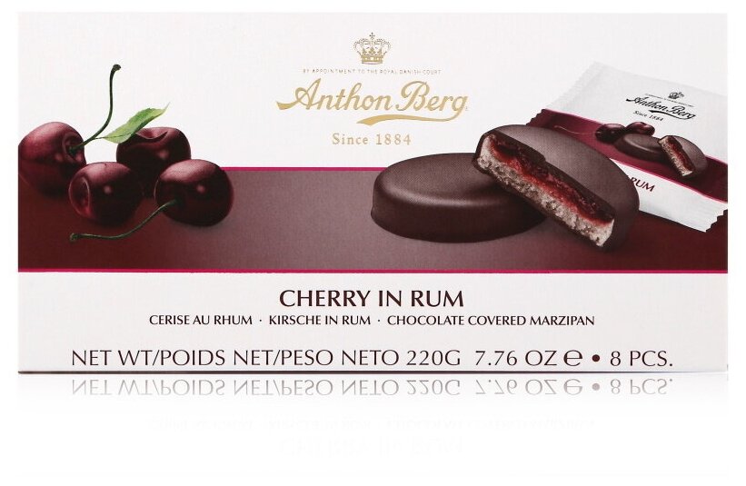 Конфеты с марципаном "Вишня в роме" - вкуснейшая новинка от официального поставщика Датского королевского двора. Марципановые конфеты, покрытые тонким слоем шоколада, с изысканной начинкой из вишни и рома внутри.
