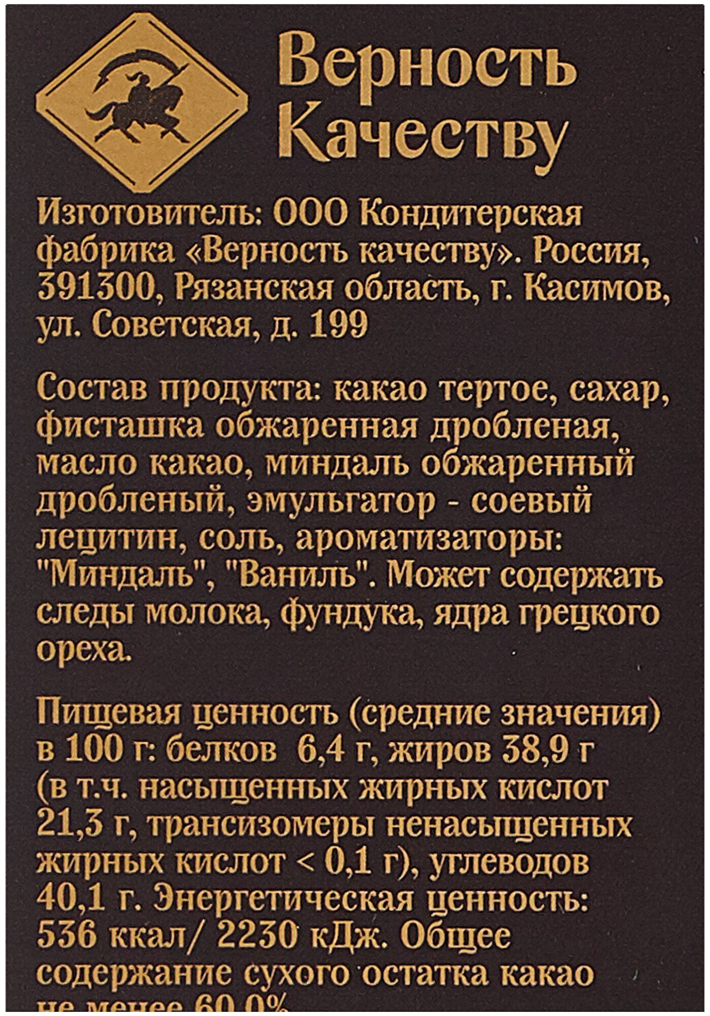Горький шоколад с кусочками сицилийской фисташки и миндалем прекрасно гармонируют с манго, карамельным кофе, сладкими ликерами и сыром камамбер.