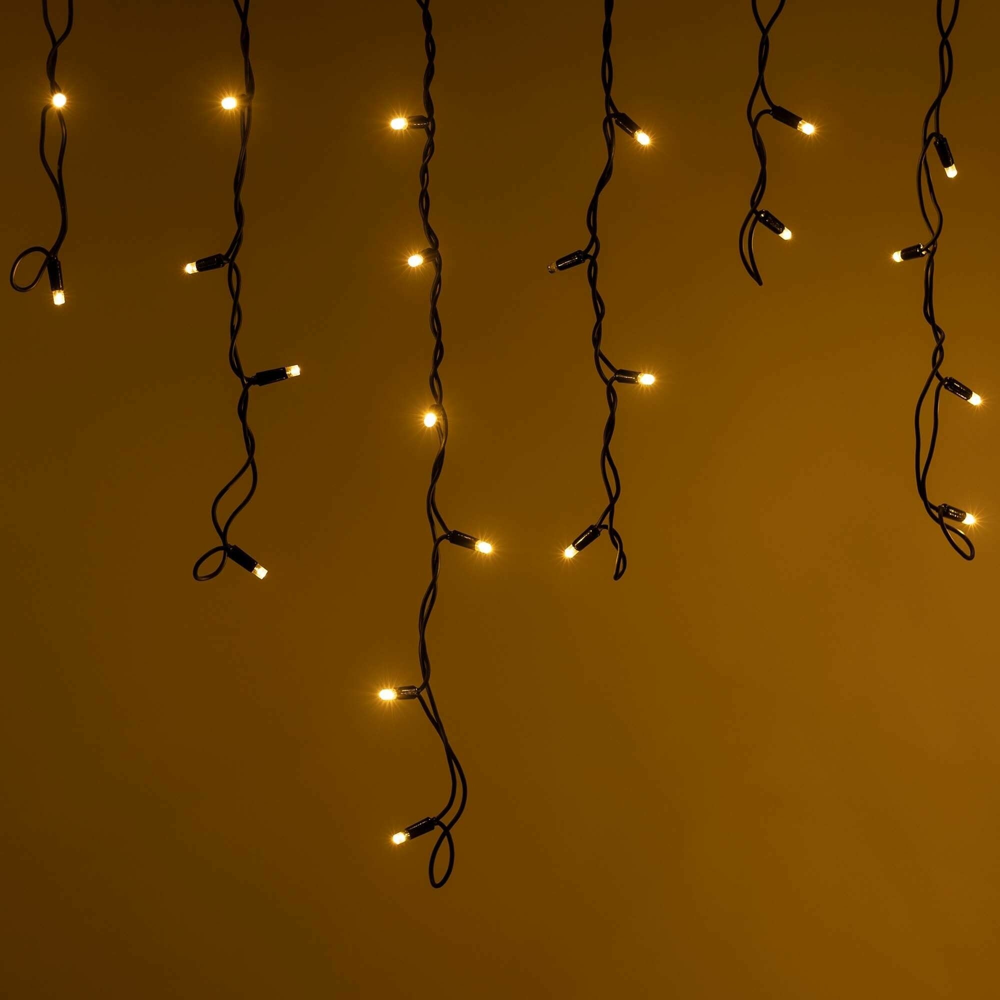 Светодиодная гирлянда "Бахрома" серии PRO. Размер 4000x600 (длина 4000 мм, максимальная высота 600 мм). Цвет светодиодов тёплый белый (3000К). Эффект мерцания (Тёплый Белый цвет 3000К). 180-200 вспышек в минуту. Материал провода - чёрный резиновый (каучук). Диаметр провода 3.3 мм. 32 нити длиной от 200 до 600 мм, ниспадающих вниз. Количество светодиодов 128 шт. Размер светодиодов 5 мм с защитным колпачком и вогнутой внутрь линзой. Напряжение питания DC 230V, потребляемая мощность 8W, IP65. Для подключения одной гирлянды или нескольких гирлянд к сети необходимо приобрести провод питания с выпрямителем AC/DC. Универсальная светодиодная гирлянда "бахрома" серии PRO, предназначенная для реализации уличных проектов освещения с низкими температурами окружающей среды. Благодаря наличию универсальных соединительных разъемов, имеется возможность нарастить длину до 50 метров без дополнительных аксессуаров. Подобная функциональность позволяет реализовать проект декоративного освещения практически любого масштаба.