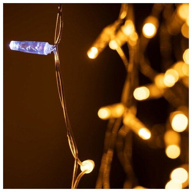Светодиодная гирлянда бахрома серии CLASSIC. Размер 2400x600 (длина 2400 мм, высота 600 мм). Цвет светодиодов жёлтый, эффект мерцания 180-200 вспышек в минуту, цвет мерцающих светодиодов белый (6000 К). Провод из прозрачного ПВХ, диаметр 2.3 мм, 24 ниспадающие нити длиной от 200 до 600 мм. 88 светодиодов размером 7 мм, прозрачный вогнутый колпачок. Напряжение питания 230 В, потребляемая мощность 6 Вт, степень пылевлагозащиты IP65. Для эксплуатации необходимо приобрести аксессуар для подключения.