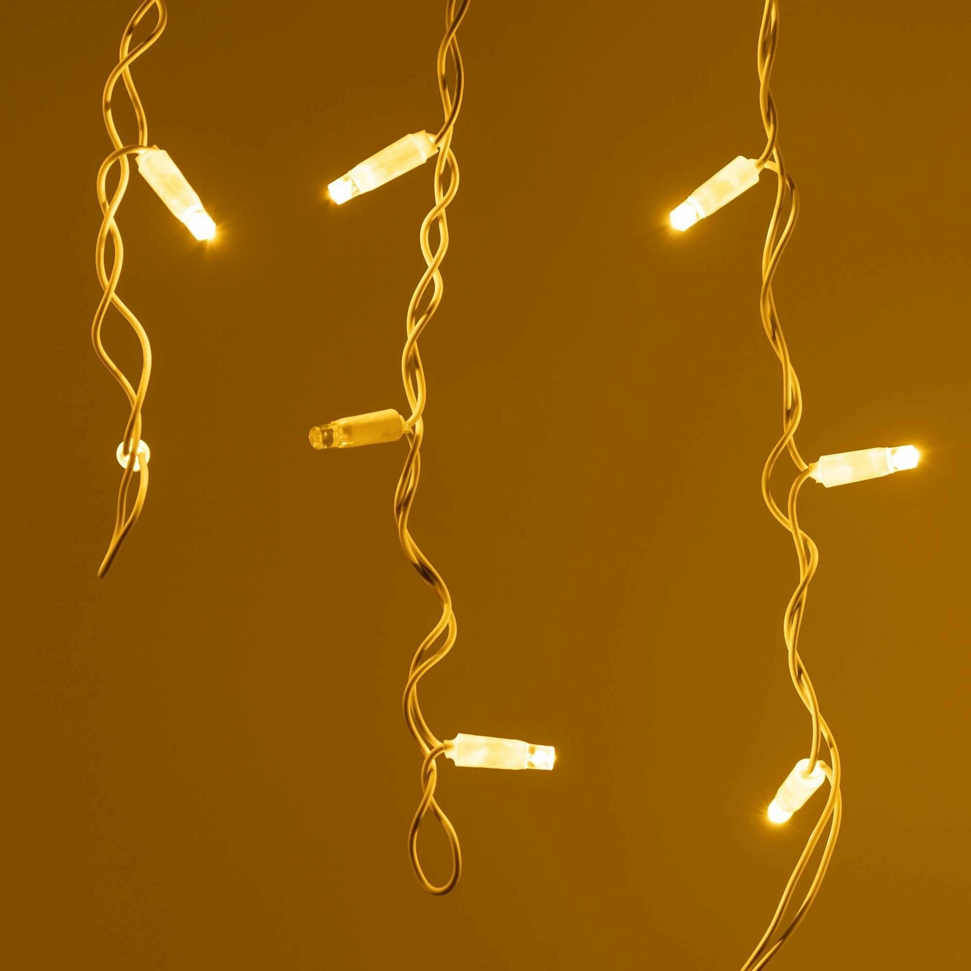 Светодиодная гирлянда бахрома серии CLASSIC. Размер 2400x600 (длина 2400 мм, высота 600 мм). Цвет светодиодов теплый белый (3000 К), эффект мерцания 180-200 вспышек в минуту, цвет мерцающих светодиодов теплый белый (3000 К). Провод из белого ПВХ, диаметр 2.3 мм, 24 ниспадающие нити длиной от 200 до 600 мм. 88 светодиодов размером 7 мм, прозрачный вогнутый колпачок. Напряжение питания 230 В, потребляемая мощность 6 Вт, степень пылевлагозащиты IP65. Для эксплуатации необходимо приобрести аксессуар для подключения. Универсальная светодиодная гирлянда "бахрома" серии Classic, предназначенная для декорирования и создания праздничного настроения как внутри помещений, так и снаружи (при соблюдении условий монтажа). Благодаря наличию универсальных соединительных разъемов, имеется возможность нарастить длину до 50 метров без дополнительных аксессуаров. Подобная функциональность позволяет реализовать проект декоративного освещения практически любого масштаба.