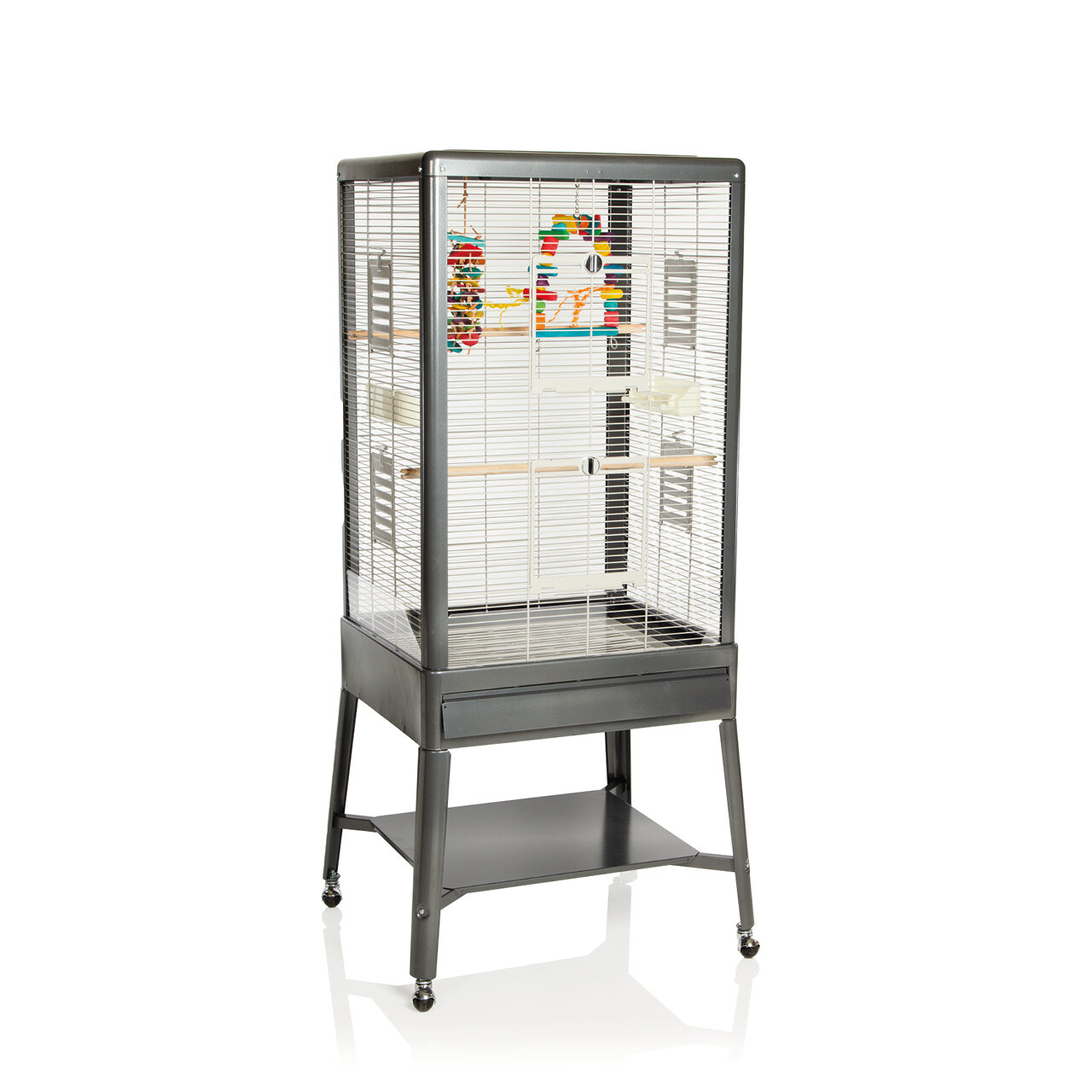 Внешний вид впечатляет особым сочетанием окраски «антик» и «платина». Две главные двери (примерно 24x24 см) и две меньшие двери (примерно 18x14 см) с каждой стороны обеспечивают хороший доступ внутрь для кормления и уборки. В нижней части находится решетка и ящик для мусора (прибл. 57x53 см), которые в закрытом состоянии защищены декоративной панелью. Благодаря четырем устойчивым колесикам эту клетку можно легко перемещать.