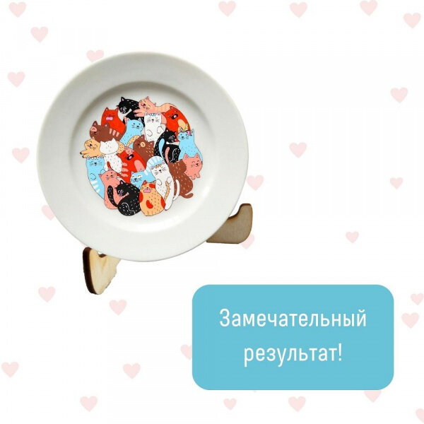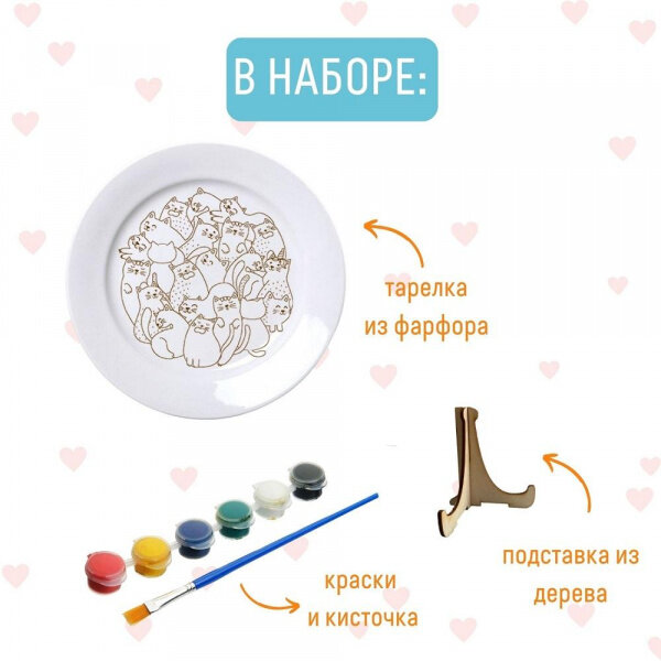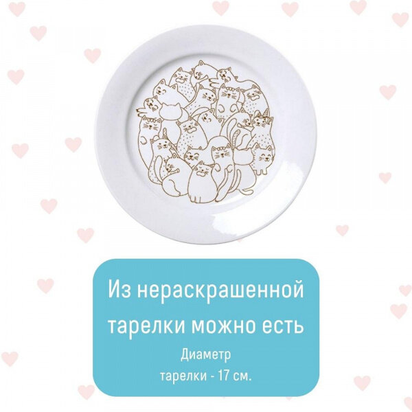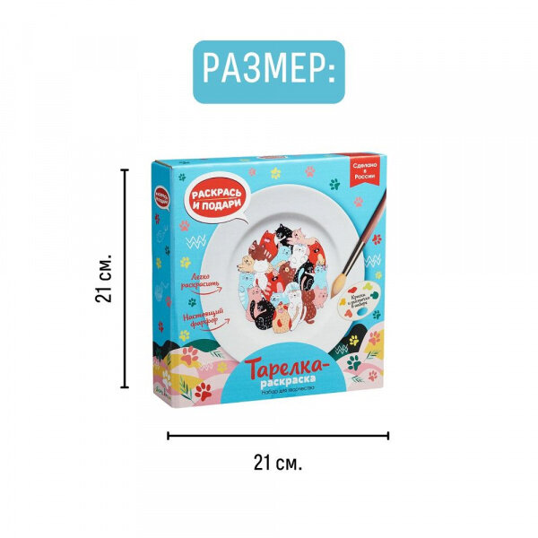 Тарелка раскраска Котики – творческий набор, который пробуждает вдохновение у маленьких и взрослых любителей очаровательных мурлык. Сделайте необычную декоративную поделку для украшения дома или используйте посуду для подачи блюд! Бумбарам предлагает для росписи: плоскую фарфоровую тарелку диаметром 17 см; палитру красок из 6 базовых цветов; кисточку; сборную деревянную подставку для хранения. Дно столового изделия украшено четким контурным рисунком. Симпатичных котят с разными и смешными выражениями мордочек маленький фантазер может раскрасить, как хочется. При желании красочное покрытие можно смыть водой. Тогда с тарелки можно будет есть. А если вам хочется сохранить сувенир, поместите его в духовку, разогретую до 120°C, на 15 минут, чтобы краска закрепилась. Радуйтесь творчеству и результатам своих стараний! Параметры товара: диаметр тарелки 170 мм, упаковка – картонная коробка 215х210х40 мм Рекомендованный возраст: от 6 лет