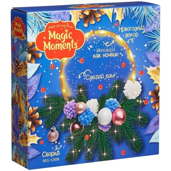 Набор для создания декора Венок сиреневый, арт. GO-2 В этом наборе вы найдете всё необходимое, чтобы создать красивый новогодний декор для дома. Прикрепите к деревянному кругу еловые ветки, шарики, мягкие помпоны и гирлянду и украшение готово! Кстати, помпоны вы тоже сделаете сами с помощью специальной заготовки. В наборе есть подробная инструкция. Красивый новогодний венок с гирляндой создаст праздничное настроение в вашем доме. Помпоны и шарики на венке имеют красивый фиолетовый цвет, поэтому можно будет легко добавить его в минималистичный интерьер. В комплекте также есть гирлянда, ее нужно будет обернуть вокруг деревянного ободка. Красивый теплый свет обязательно добавит уюта, также такой венок можно повесить в комнате и использовать как ночник, а можно украсить им входную дверь. В наборе: основа для венка из фанеры, хвойные ветки, пряжа, заготовка для помпонов, инструкция на русском языке, елочные шарики в ассортименте, гирлянда с теплым светом. Батарейки в комплект не входят. Возраст: 6+ Magic Moments наша торговая марка. Гарантируем высокое качество и лучшие условия! Производство: Россия