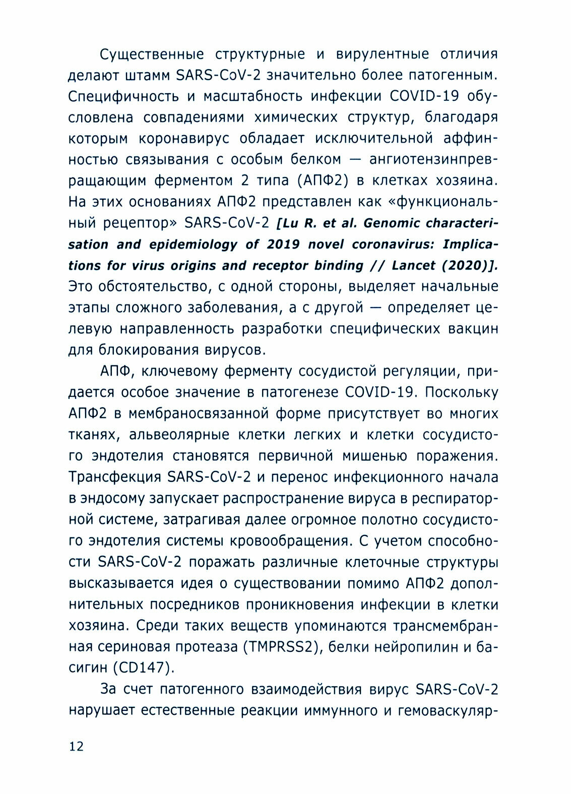 В новой работе профессора О.А. Гомазкова, известного ученого-патофизиолога и биохимика, суммированы современные сведения о коронавирусе (патология COVID-19) как результат анализа научной и клинической литературы. Предыдущий опыт О.А. Гомазкова, автора работ по функциональной биохимии (кининам, АПФ, ангиотензинам, нейротрофическим факторам и др.), позволил выделить ведущие линии патогенеза, вызываемого коронавирусом, и его последствий. В качестве основных частей («сюжетов») в книге представлены: «Клеточные и молекулярные механизмы патогенеза CОVID-19 — триада поражений сосудистого эндотелия», «Постковидный синдром. Патофизиология системных дизрегуляций», «Избирательная нейротропноость коронавируса» (механизм нарушений нервной системы), «Витамин D3 – многоликий, загадочный, необходимый», как новый подход в защите систем организма. В результате анализа информационного материала акцентированы ведущие клеточные и молекулярные мишени патогенеза COVID-19 и возможности новых подходов терапии.
