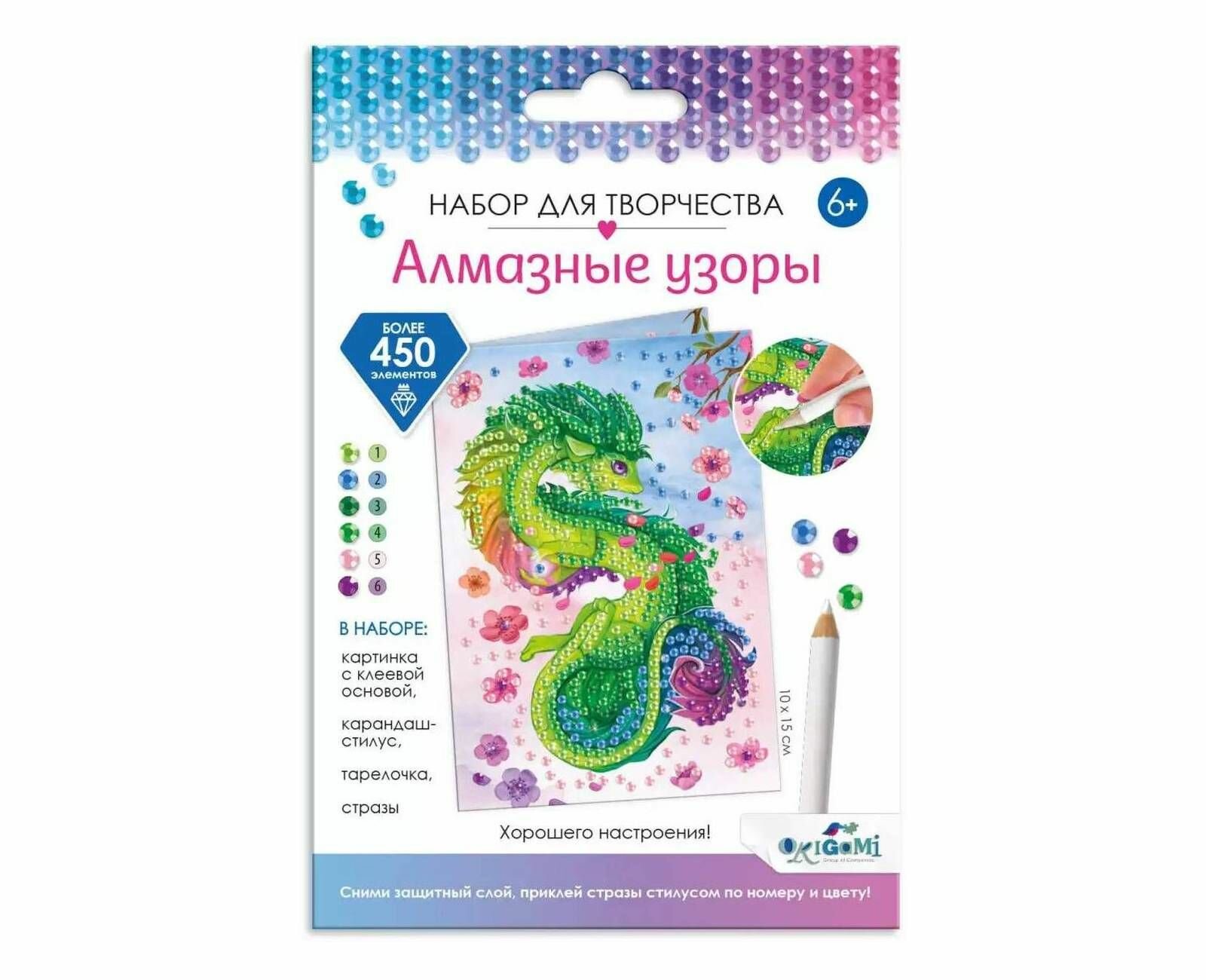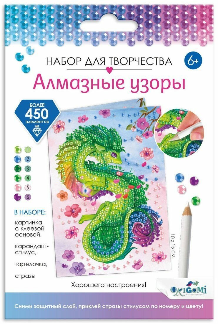 Открытка с зедёным драконом удачи в формате "укрась и подари" подарит радость и веселье самым близким! Более 500 страз в комплекте оживят красочную иллюстрацию ярким блеском. Творчество-антистресс поможет расслабиться и забыть о повседневных заботах. Процесс создания позволит улучшить мелкую моторику рук и станет интересным хобби для взрослых и детей. Уютный подарок и медитация 2в1!