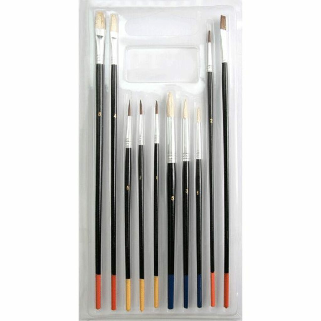 Практичный набор кистей из натурального волоса различных форм и размеров. Деревянная лакированная ручка, пластиковый блистер. В составе набора:кисти пони круглая №1,3,5; кисть пони круглая №2 с длинной ручкой; кисть пони № 4 плоская с длинной ручкой; кисти щетина круглая №1,3,5; кисти щетина плоская №4,8 с длинной ручкой.