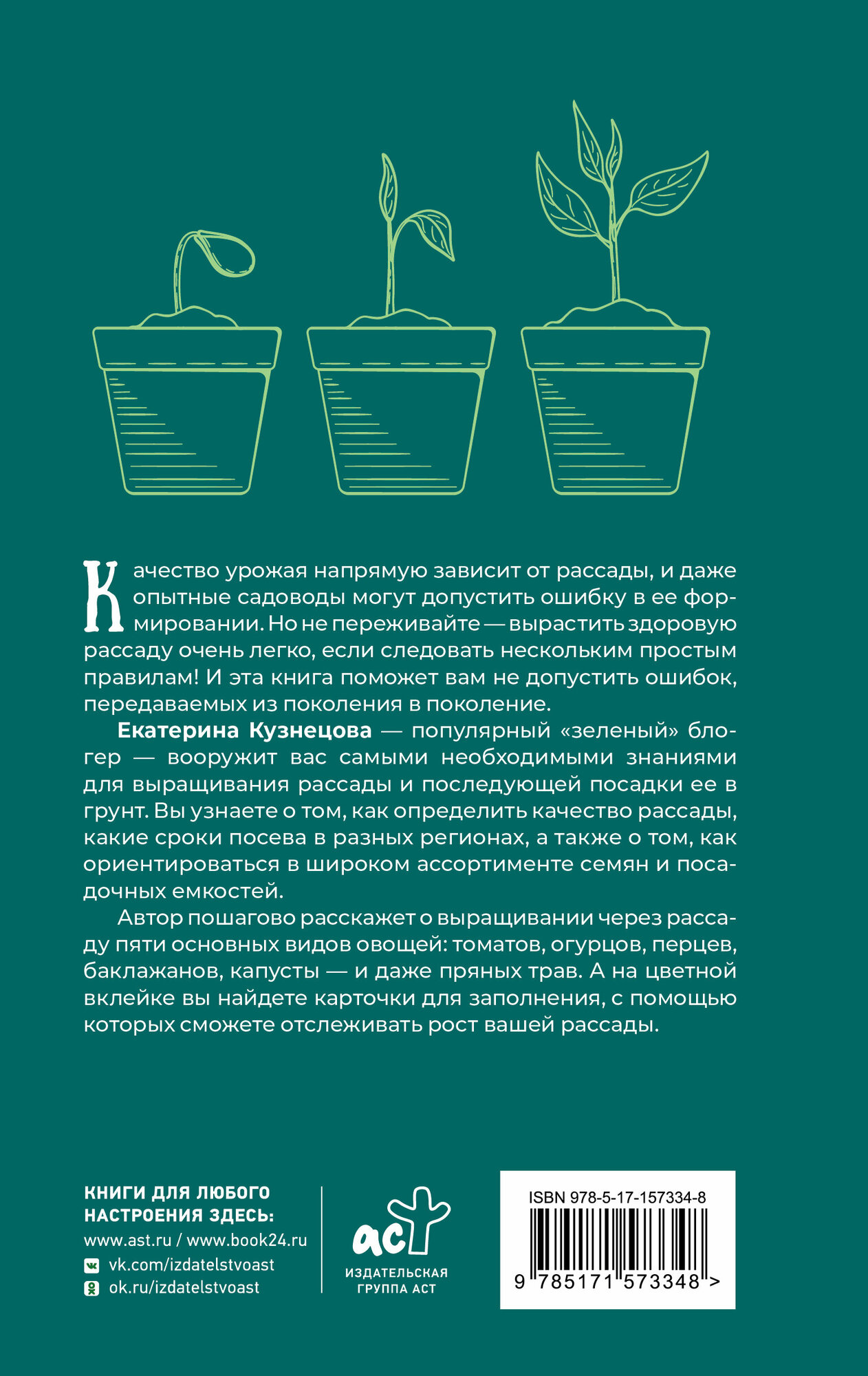 Автор пошагово расскажет о выращивании через рассаду пяти основных видов овощей: томатов, огурцов, перцев, баклажанов, капусты — и даже пряных трав. А на цветной вклейке вы найдете карточки для заполнения, с помощью которых сможете отслеживать рост вашей рассады.