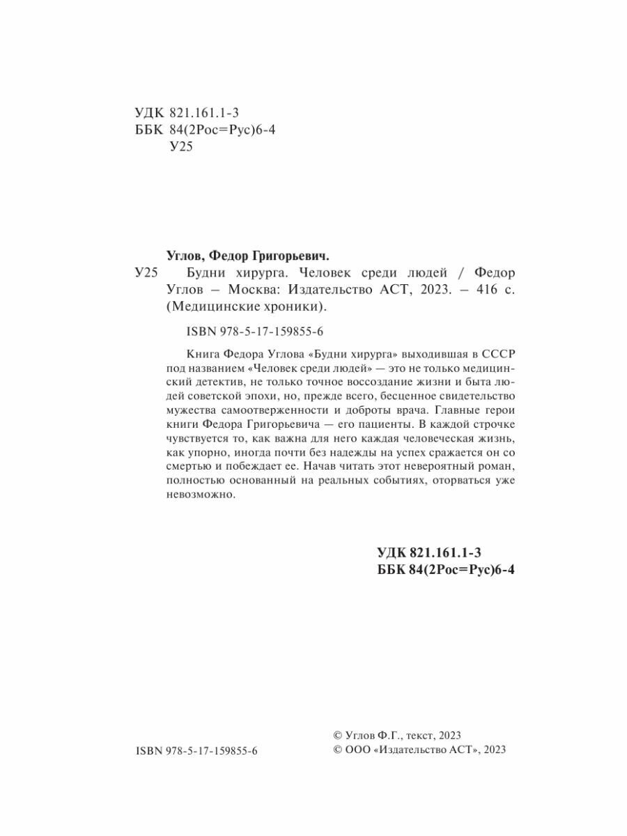 Книга Федора Углова "Будни хирурга", выходившая в СССР под названием "Человек среди людей" — это не только медицинский детектив, не только точное воссоздание жизни и быта людей советской эпохи, но прежде всего бесценное свидетельство мужества самоотверженности и доброты врача. Главные герои книги Федора Григорьевича — его пациенты. В каждой строчке чувствуется то, как важна для него каждая человеческая жизнь, как упорно, иногда почти без надежды на успех сражается он со смертью и побеждает ее. Начав читать этот невероятный роман, полностью основанный на реальных событиях, оторваться уже невозможно.