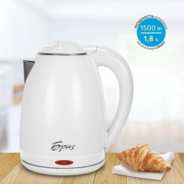 Электрический чайник \"Бриз\" с механическим типом управления удобен в обращении и способен за один раз нагреть до 1,8 л воды. Стильный современный дизайн позволяют чайнику гармонично смотреться в любом помещении, будь то кухня или офис. Благодаря вращающейся подставке прибор может поворачиваться на 360 градусов. Световая индикация сообщит, о готовности к работе. После закипания устройство автоматически отключится.