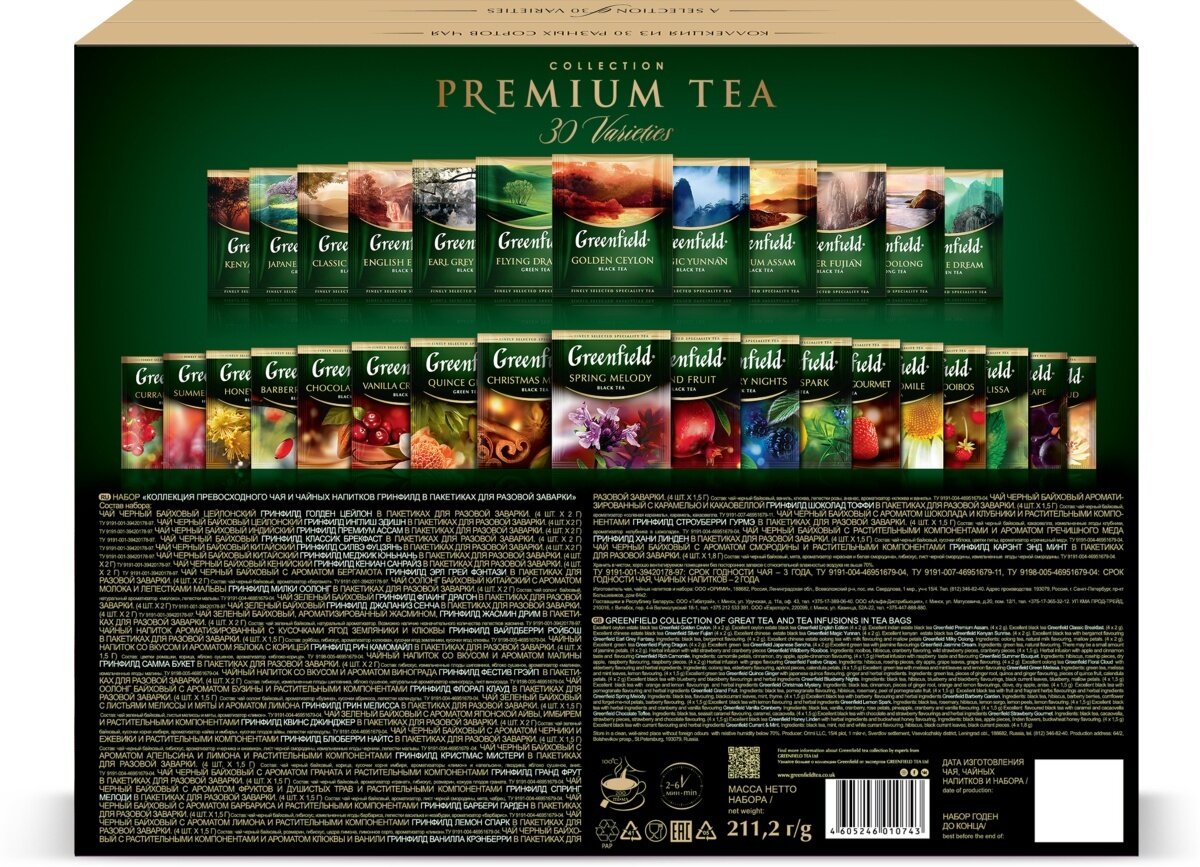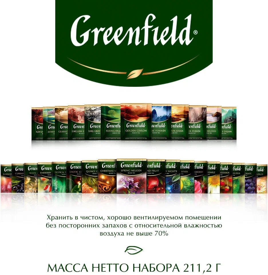 Коллекция пакетированного чая Greenfield представляет редкие сорта черного и зеленого плантационного чая, великолепные чайные композиции с ягодами, фруктами, лепестками цветов и душистыми травами и натуральные травяные чаи без содержания кофеина.