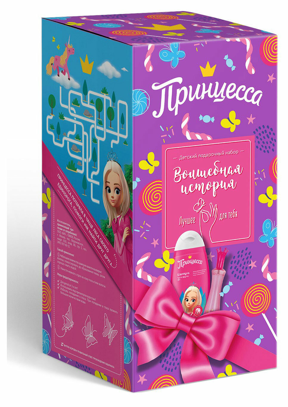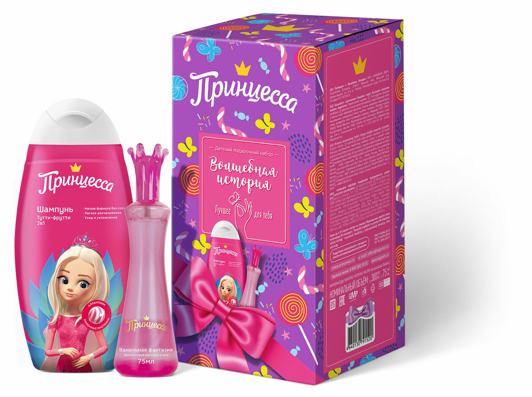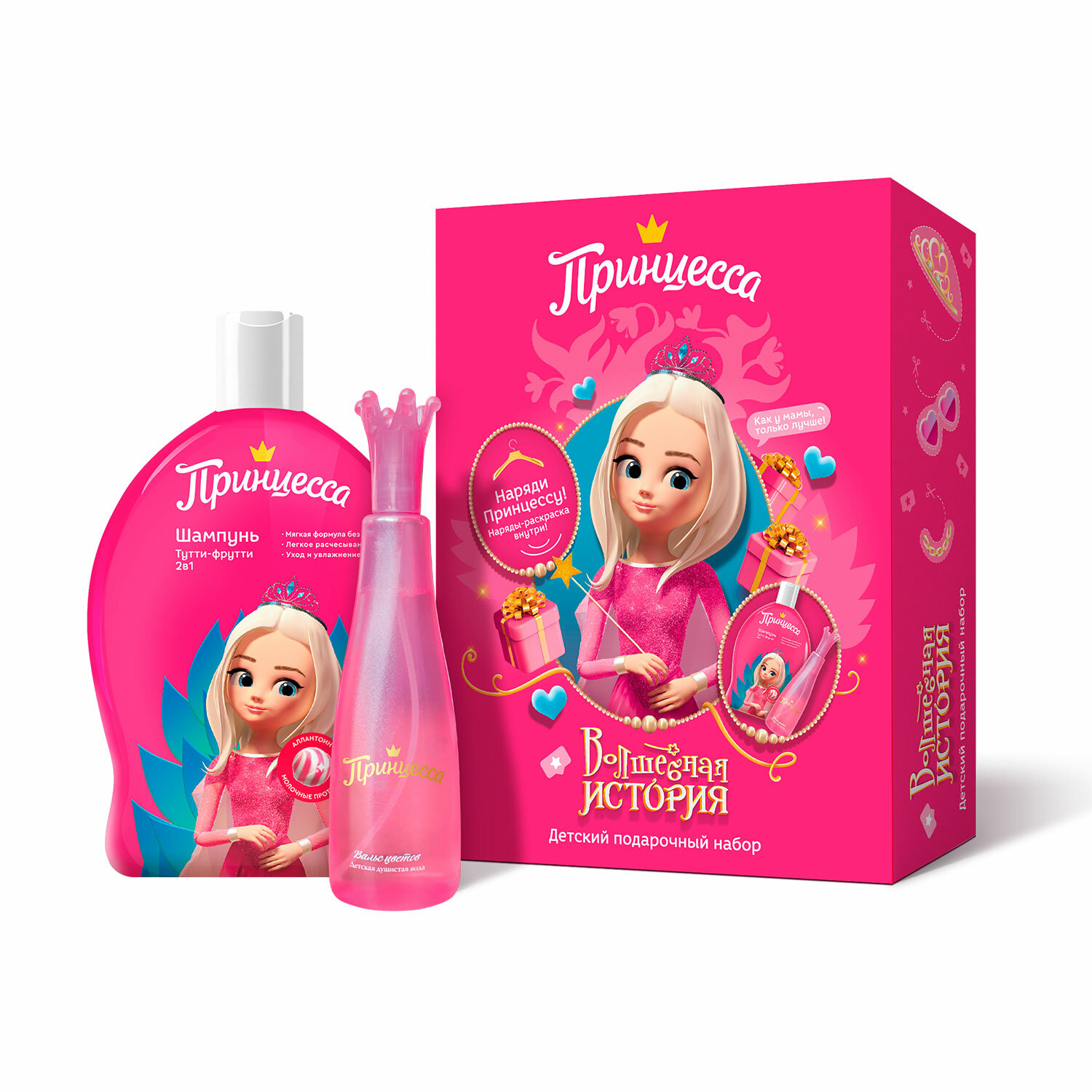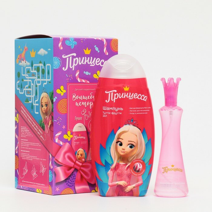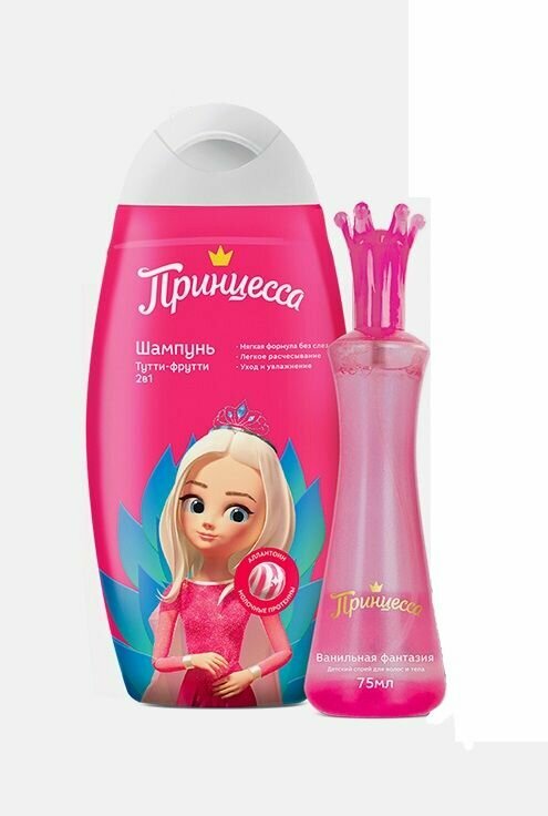 Принцесса дарит по-настоящему королевский уход с новым подарочным набором! Новейшие рецептуры, мягкий состав, богатство масел, витаминов и экстрактов помогут юной Принцессе оставаться прекрасной в любое время дня и ночи. Шампунь с кондиционером обеспечит мягкое очищение, даря особый уход и легкое расчесывание. Утонченный аромат детского бесспиртового спрея окутает юную красавицу, подчеркнув ее неповторимый стиль и очарование. Красота и нежность - Волшебная история Принцессы!