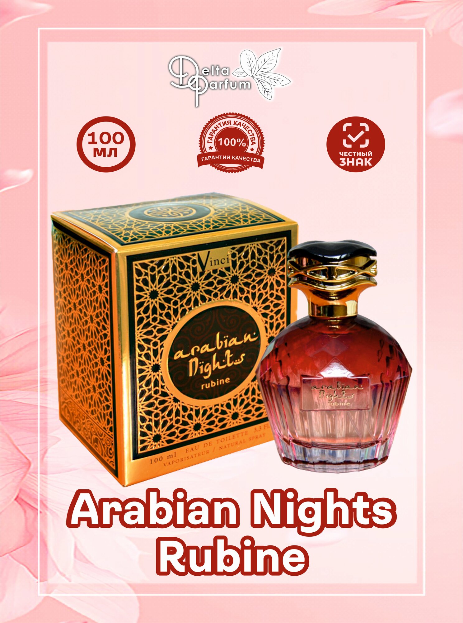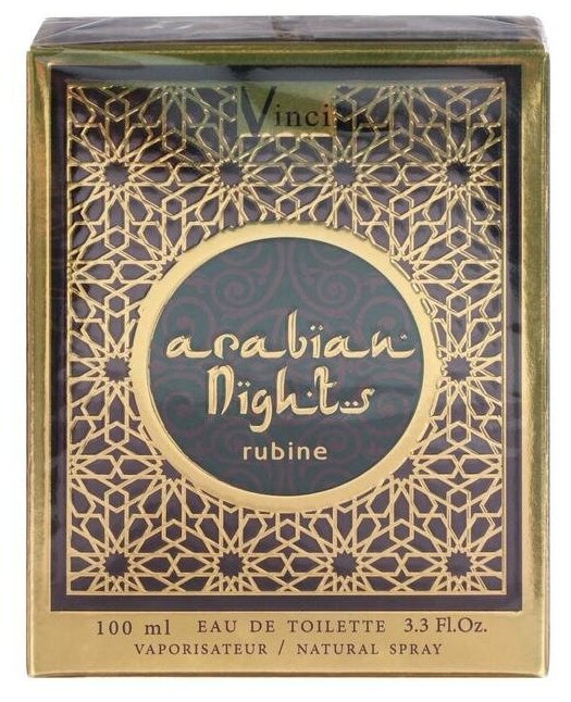 Туалетная вода "Arabian Nights Rubine" - это восточная цветочная композиция, созданная в 2018 году. Она представляет собой гармоничное сочетание верхних нот черной смородины, сливы, персика и мандарина, средних нот гвоздики, гиацинта, туберозы и жасмина, а также базовых нот ванили и амбры.