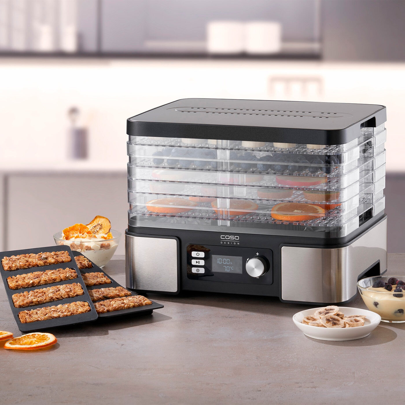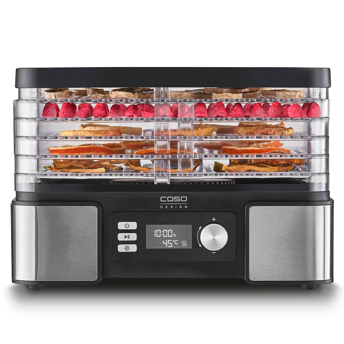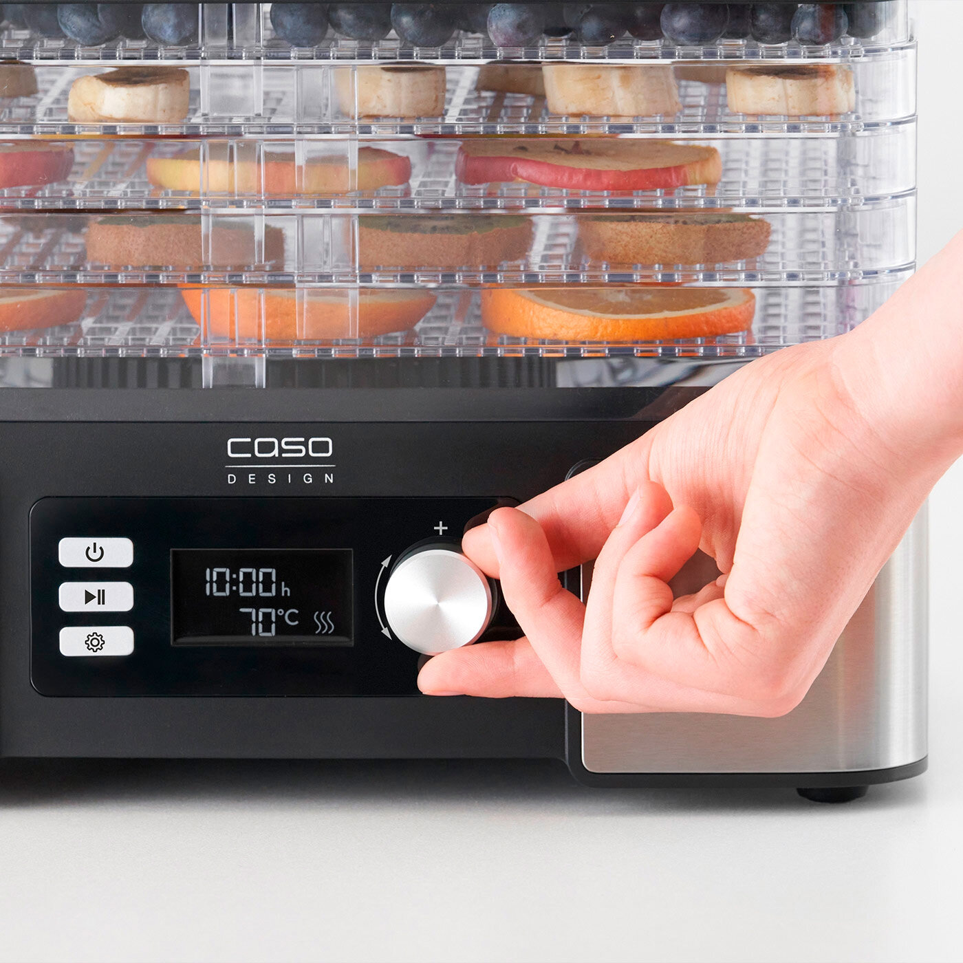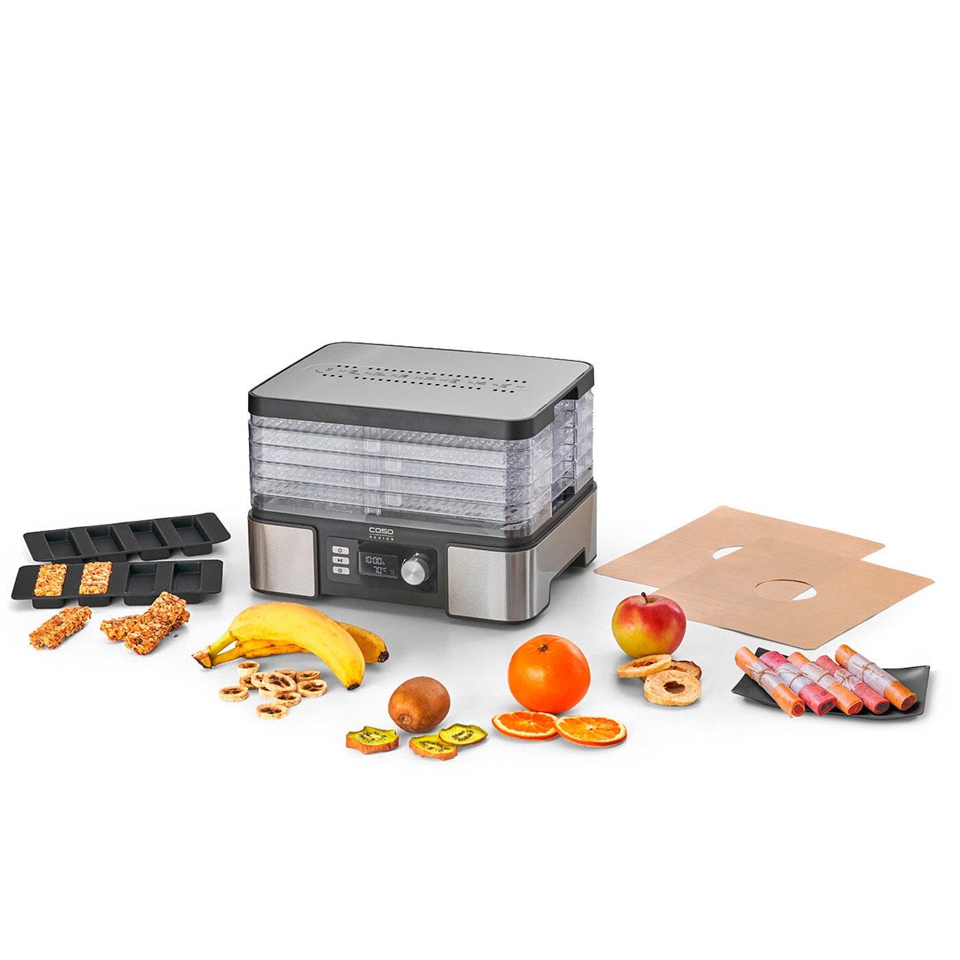Устройство CASO (Касо) позволяет легко готовить полезные перекусы, вкусные угощения и многое другое. Процесс обезвоживания удаляет воду из пищевых продуктов и, таким образом, мягко продлевает период хранения. Аппарат для сушки отлично подходит для приготовления таких лакомств, как сухофрукты, чипсы, пастила - все это можно создавать без добавления сахара и консервантов.