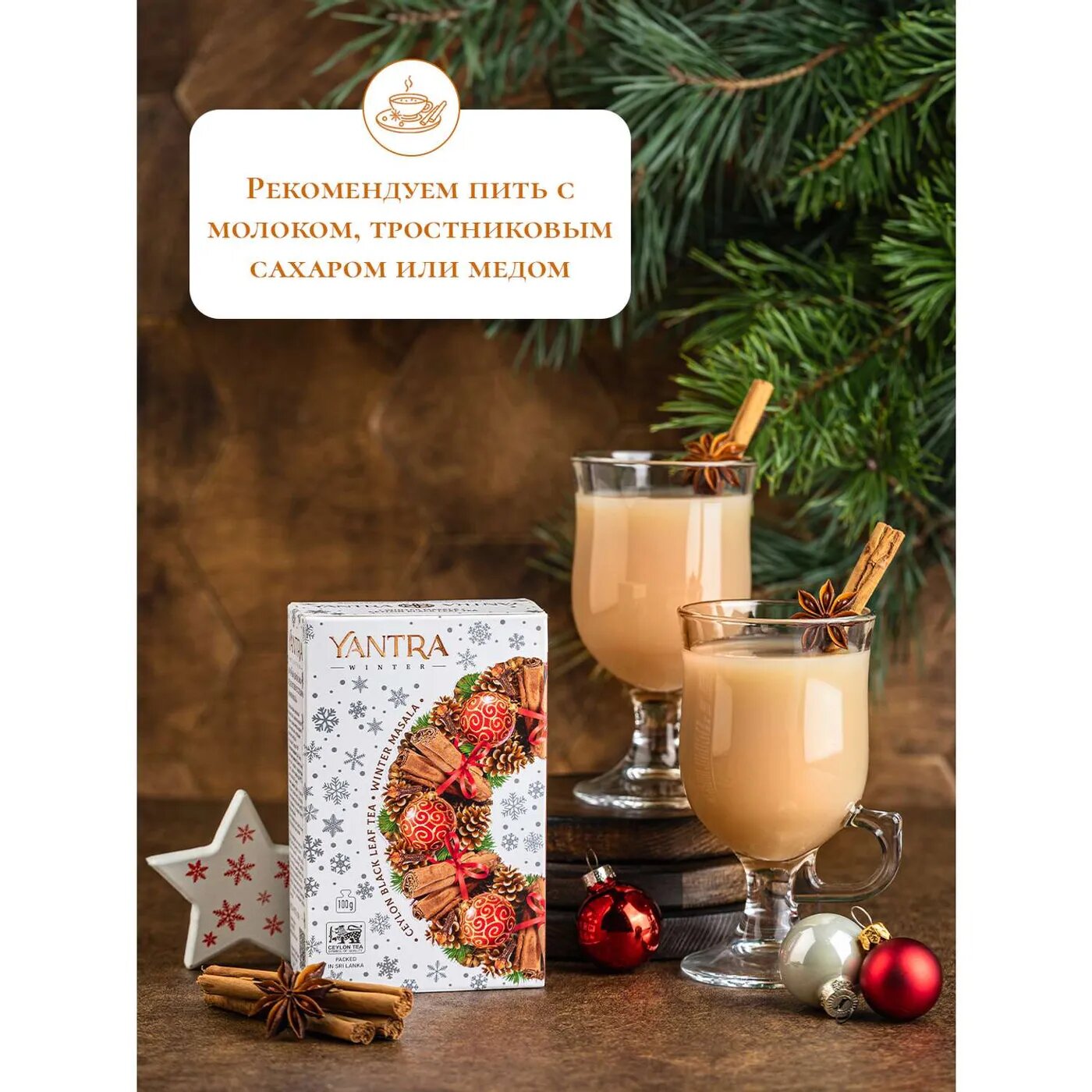 | Состав | Чай черный цейлонский листовой (стандарт FBOP), цейлонская корица, гвоздика, сушеный имбирь, кардамон, сушеный перец чили, натуральный. |