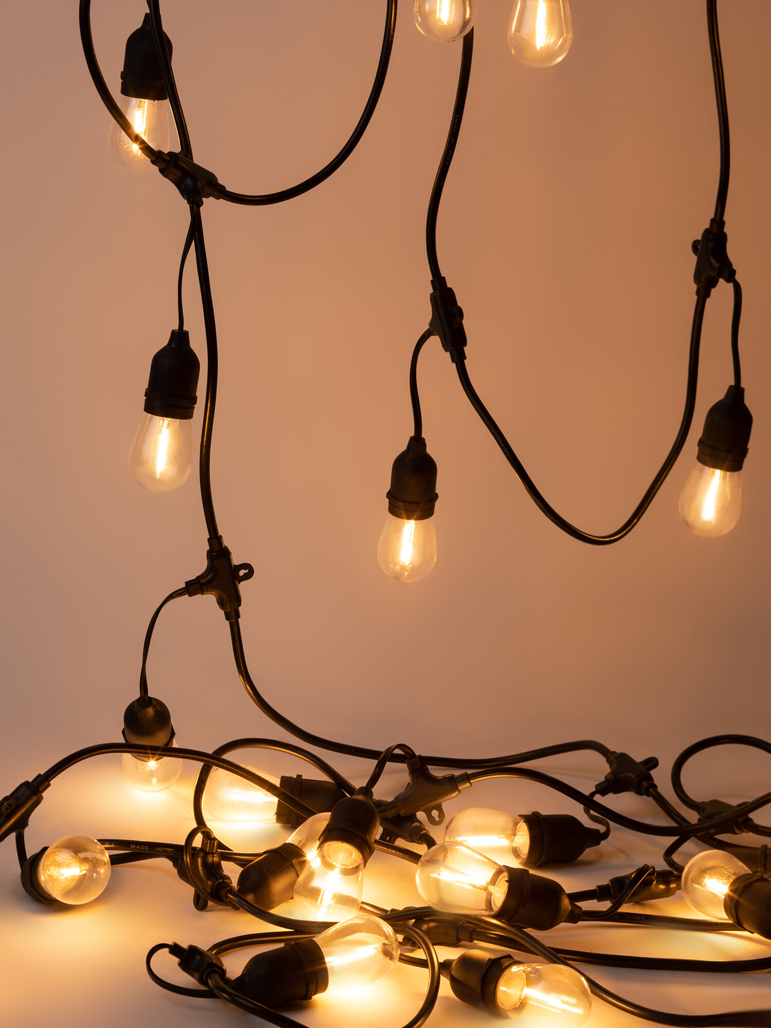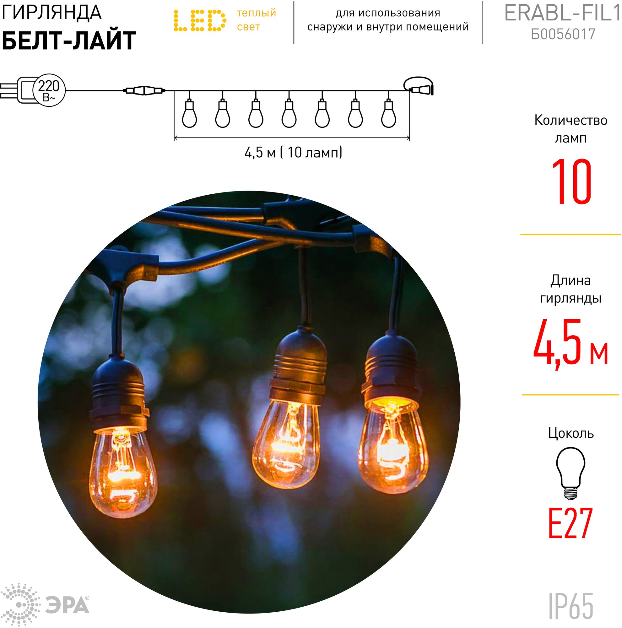 Филаментная светодиодная гирлянда Белт-лайт впервые на российском рынке! Гирлянда уличная ЭРА ERABL-FIL1 с десятью ретро-лампочками на подвесах светит уютным теплым светом. В комплекте 10 LED-ламп удлиненной винтажной формы с нитевидными светодиодами, стилизация под традиционные лампы накаливания. Гирлянда в ретро-стилистике с лампочками на подвесах отлично подходит для новогодних праздников, оформления вечеринок, декорирования двора загородного дома, декоративной подсветки сада, веранды. Гирлянда филаментная ЭРА Белт-лайт подходит для применения снаружи и внутри помещений. Гирлянда новогодняя уличная изготовлена из надежного каучука, защищена от влаги и пыли (IP65). Лампы сменные, патроны под стандартные лампочки Е27. Длина световой части гирлянды - 4,5 метра, длина провода - 60 см. В ассортименте ЭРА есть аналогичная гирлянда с 20 лампами - арт. Б0056018.